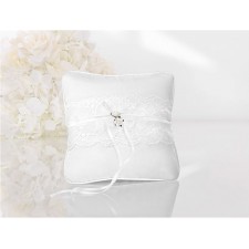 Ottimo accessorio per ultimare le decorazioni in vita del proprio matrimonio, l'oggetto, presentato sotto forma di cuscino, sarà utile nel momento in cui ci sarà lo scambio delle fedi nuziali, con diverse decorazioni, sarà l'adorno ideale per rendere il momento ancor più magico. In stoffa, il cuscino presenta una decorazione in pizzo e rose argentate
