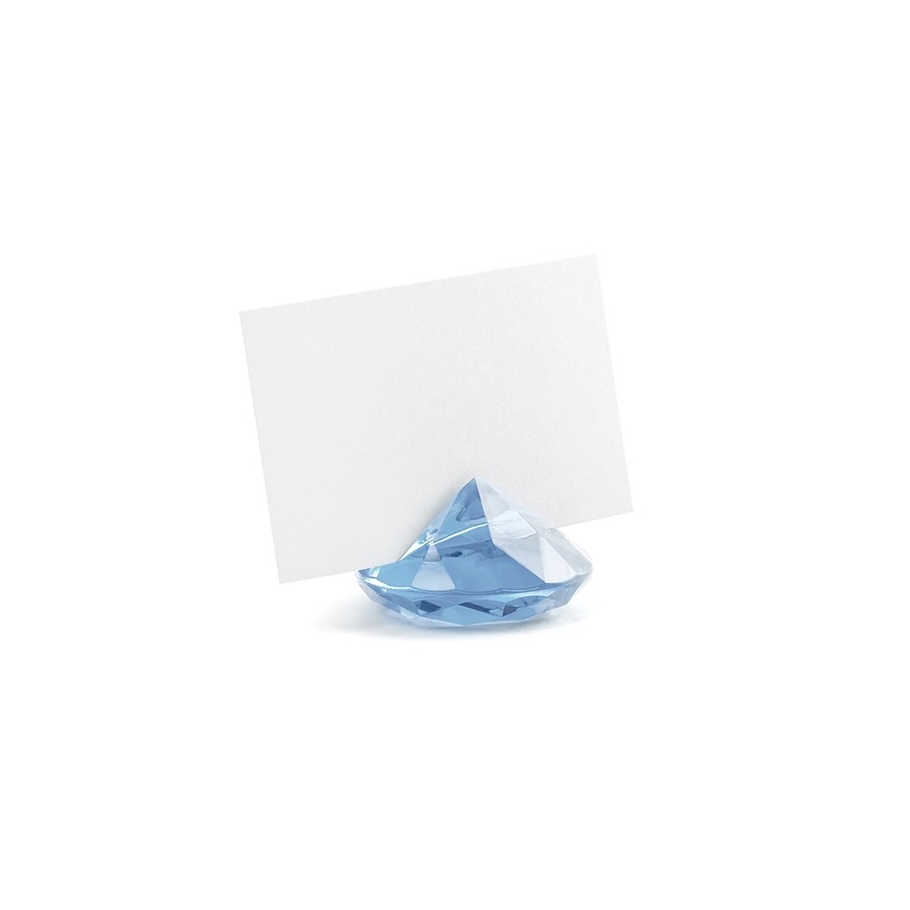 Ottimo accessorio da aggiungere all'allestimento del proprio ricevimento. Il segnaposto si presenta sotto forma di diamante, in colore Blu, Azzurro e come dettaglio principale vede una fessura al suo centro utile al supporto del biglietto personalizzabile che andrà ad indicare la seduta scelta dall'organizzatore dell'evento. Ideale per un Matrimonio, può poi essere utilizzato in occasione di un Battesimo, di una Comunione e di una Cresima senza la paura che l'adorno possa risultare eccessivo agli occhi degli invitati, anzi, l'effetto e la riuscita saranno assicurati.