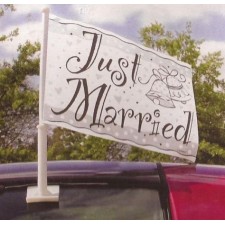 bandiera matrimonio in pvc con scritta "just married" per auto sposi, è munita di adesivo o si incastra nel finestrino