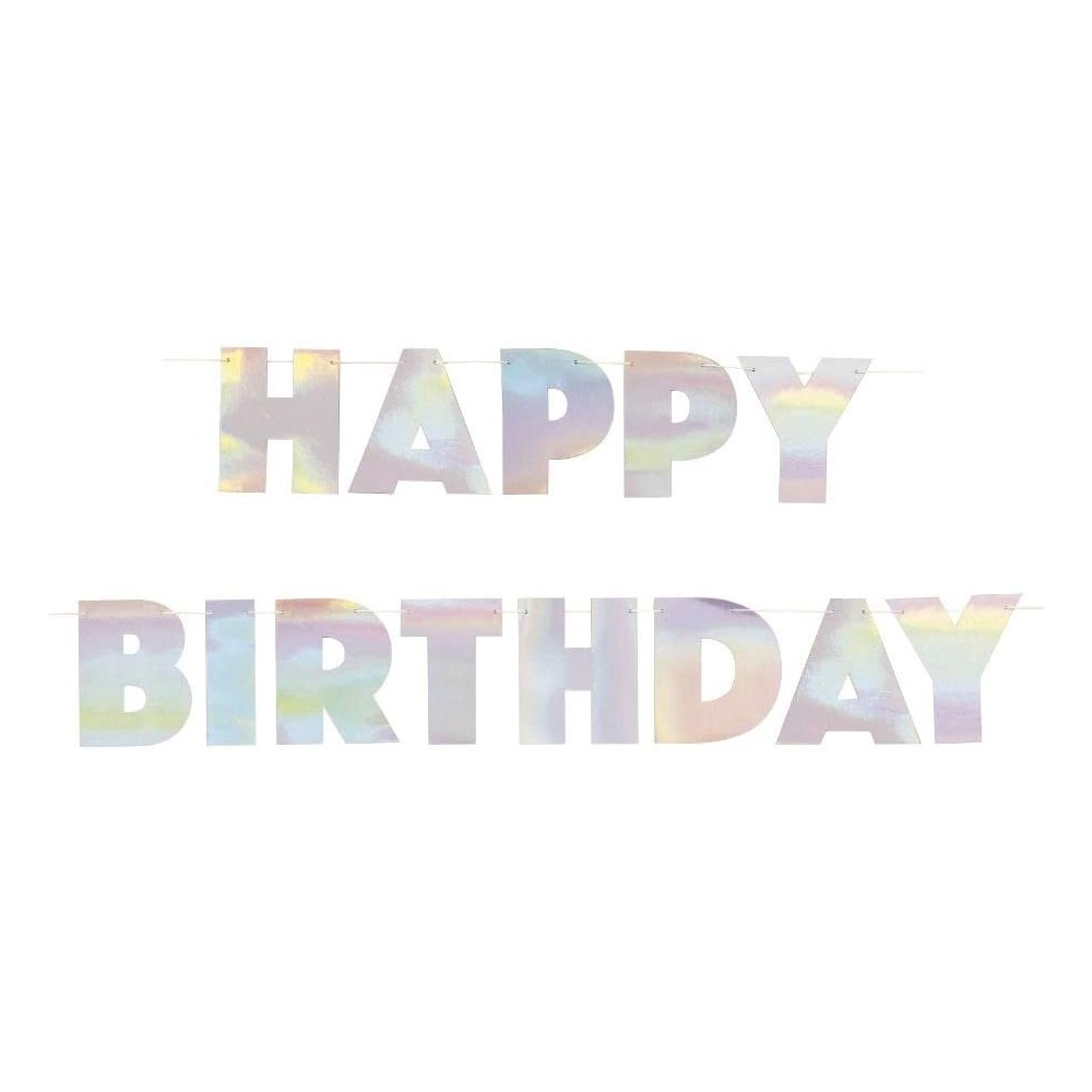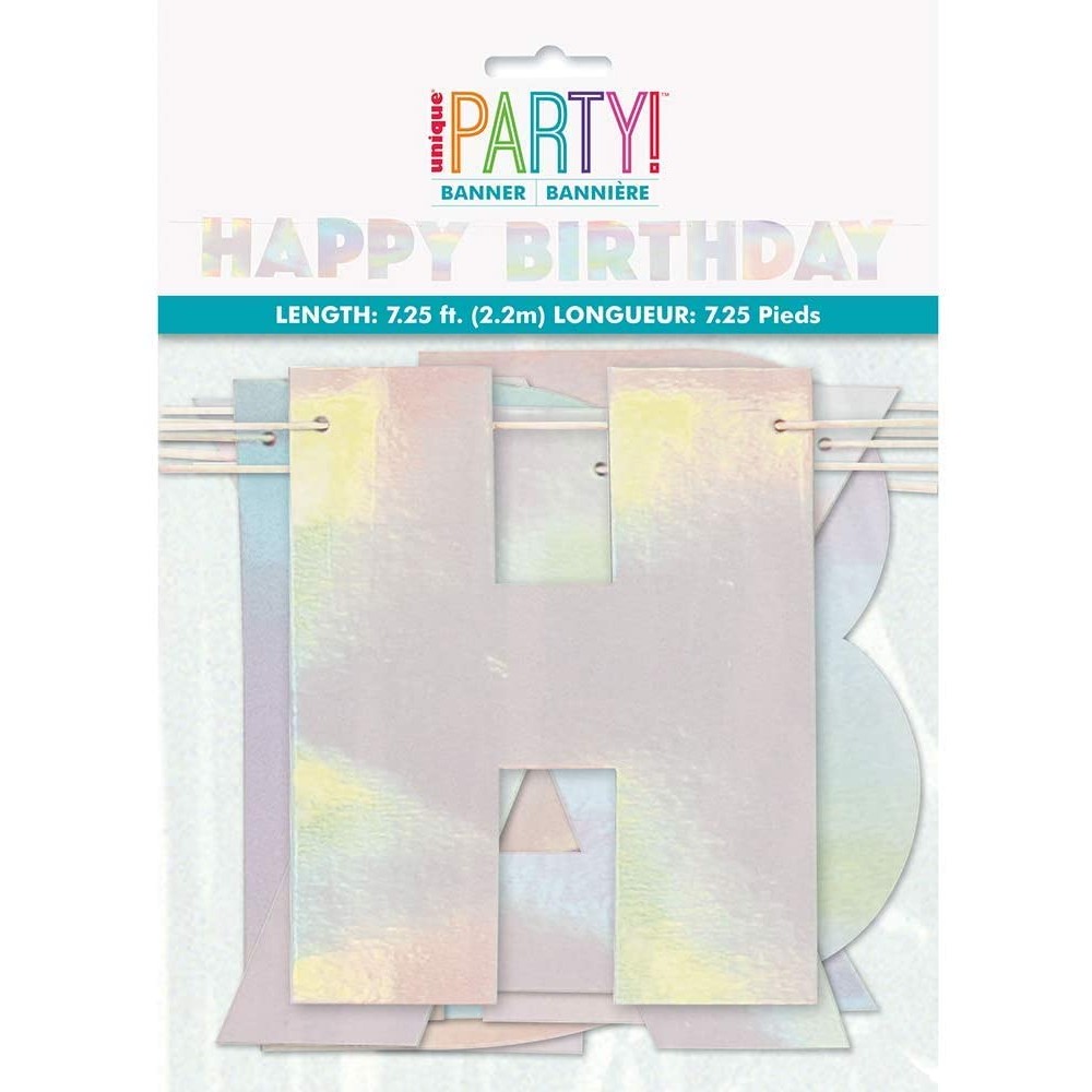 La confezione comprende 1 striscione con scritta "Happy Birthday" in colore Iridescente. Ideale per decorare una festa di compleanno a tema "Rainbow". Basta appenderlo a una parete, ad arco o al tavolo delle feste.