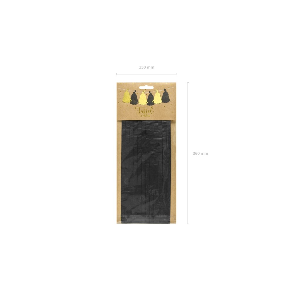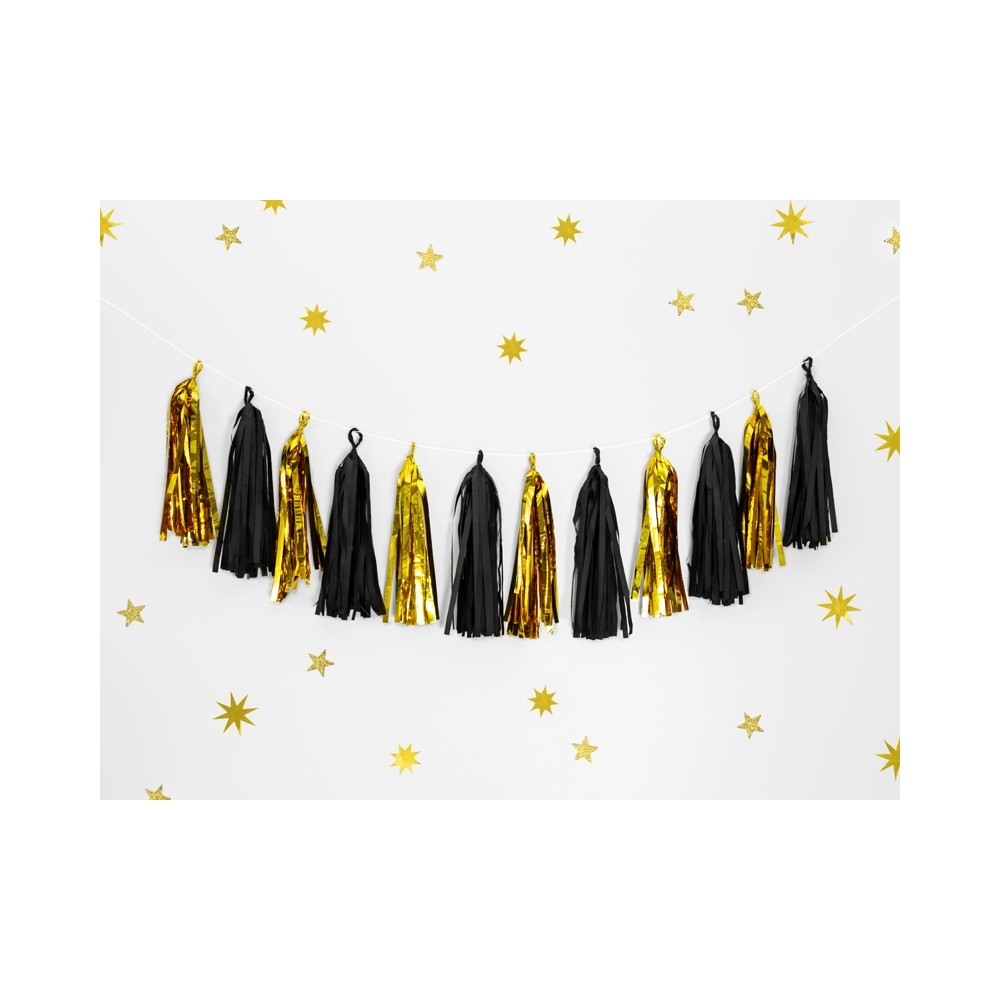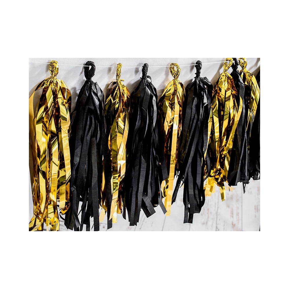Questo striscione di nappe in pvc è perfetto per la decorazione e l'addobbo di matrimoni e feste a tema per adulti e ragazzi. L'articolo comprende 6 nappe nere e 6 oro metalizzato, il cui assemblaggio è semplice e veloce, basta seguire le pratiche istruzione riportate sul retro della confezione. La ghirlanda si può attaccare anche a palloncini gonfiati a elio e combinarla ad altri festoni di questo genere, anche di diversi colori, per un effetto spettacolare garantito!