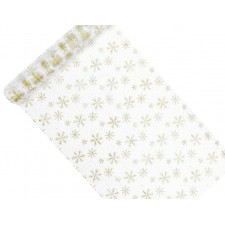 Ottimo addobbo per rendere il proprio evento migliore, grazie a questo rotolo di organza potrete dare un tocco colorato e allo stesso tempo raffinato al vostro party, il rotolo, presentato di colore bianco ed oro, vede stampata una decorazione in simil pizzo che ritrae dei fiocchi di neve in maniera tale da esser utilizzato per favorire l'eleganza dell'evento. Utile per qualsiasi tipo di festa, sarà ottimo come decorazione da tavola in vista di un pranzo o di una cena importante. Eccellente la scelta di utilizzare questo adorno alla cena di Natale o in prossimità delle feste natalizie.