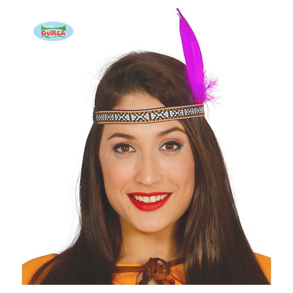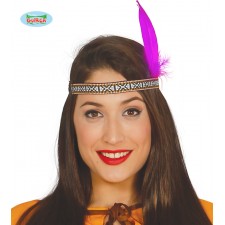 Ottimo accessorio da implementare al proprio travestimento da Indiano in vista di un party in maschera o una festa in costume. Il copricapo si presenta sotto forma di tiara, decorata con tipici simboli e ideogrammi Indiani e presenta su uno dei due lati una piuma di colore fuxia. Perfetto oggetto anche in occasione di Carnevale o Halloween, specie se abbinato ad un costume da Indiano d'America o Pellerossa.