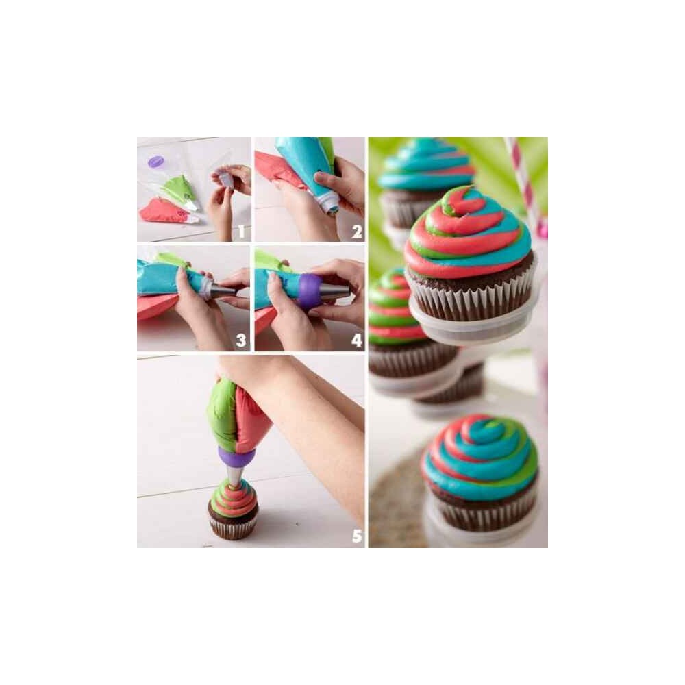 Il set per adattatore decorativo per Tre-Colori possiede tutto ciò di cui hai bisogno per poter cominciare la decorazione. Utilizza l’adattatore a Tre-Colori Coupler per creare ciuffetti di due o tre colori, senza soluzione di continuità, di crema al burro.