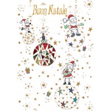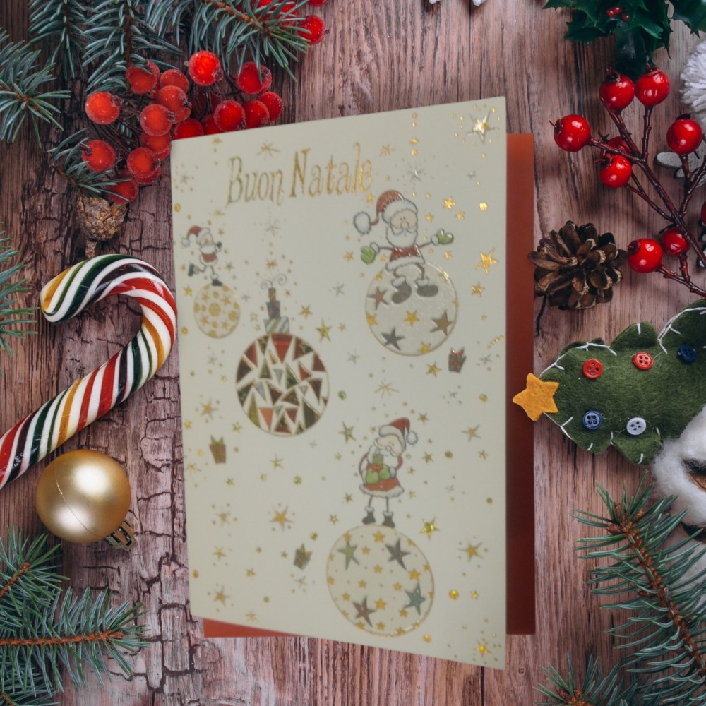 Biglietto auguri Buon Natale, Babbo Natale sopra palline natalizie, stilizzato, 12 x 18 cm