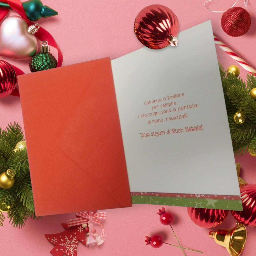 Un originale biglietto augurale natalizio in stile stilizzato, che raffigura Babbo Natale sopra quattro palline natalizie colorate. Babbo Natale, con il suo tipico abito rosso, sorride mentre osserva i regali scintillanti, spargendo gioia e sorprese ovunque. Intorno, piccoli fiocchi di neve e stelle decorano il tutto, aggiungendo un senso di magia e avventura. Un augurio perfetto per chi ama l’idea di un Natale pieno di sorprese e momenti indimenticabili.