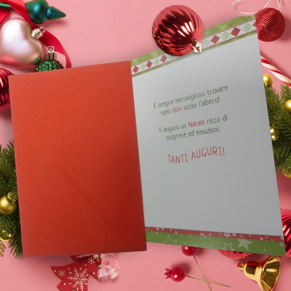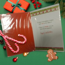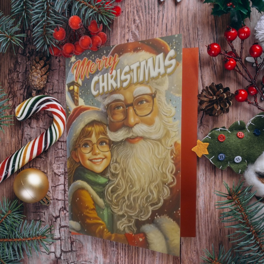 Un affascinante biglietto augurale natalizio che cattura la magia del Natale con una dolce scena: Babbo Natale, con il suo tipico abito rosso, interagisce con una bambina sorridente, creando un momento ricco di emozione e meraviglia. Sullo sfondo, dettagli festosi come fiocchi di neve aggiungono un tocco di calore e magia. Le parole 'Merry Christmas' sono scritte in un elegante carattere festivo, arricchite da elementi decorativi che rendono questo biglietto perfetto per augurare gioia e felicità a chiunque lo riceva.