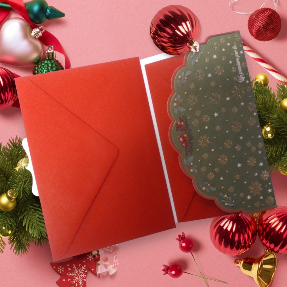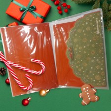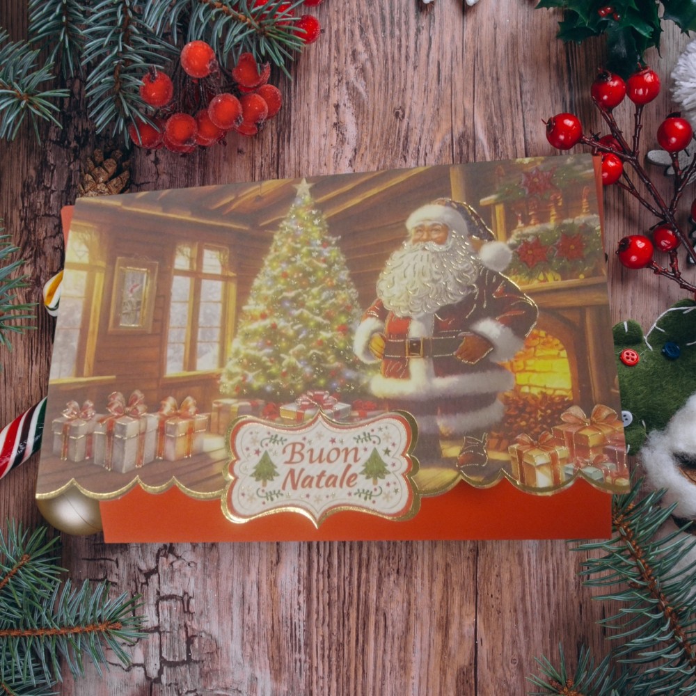 Un incantevole biglietto portasoldi natalizio decorato con Babbo Natale accanto a un magnifico albero di Natale, addobbato con luci scintillanti e palline colorate. Attorno a loro, una pila di regali splendidamente confezionati aggiunge un tocco di festa e gioia. La scritta 'Buon Natale' campeggia in caratteri eleganti e vivaci, catturando lo spirito della stagione. All'interno del biglietto, è presente una pratica tasca per inserire denaro o buoni regalo, arricchita da decorazioni natalizie che rendono il tutto ancora più festoso. Un modo perfetto per augurare un Natale felice e generoso, con un tocco speciale.