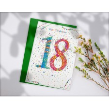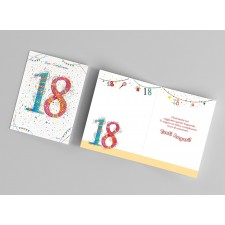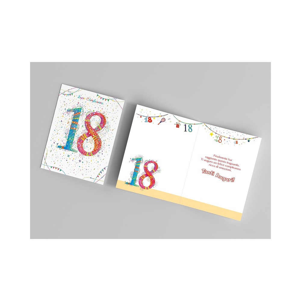 Ideale accessorio di cartoleria confezionato singolarmente da utilizzare nel giorno del 18° Compleanno di un famigliare, un amico o un collega, il prodotto, in cartoncino biodegradabile e completamente Made in Italy, viene presentato con una stampa serigrafica in rilievo con scritto "18" e all'interno del biglietto, sarà perfetto personalizzare il tutto andando a scrivere il nome dei festeggiati di fianco al messaggio di auguri "Finalmente hai raggiunto questo traguardo. Ti auguro un felice compleanno ricco di emozioni. Tanti Auguri". Ideale oggetto prodotto artigianalmente da abbinare eventualmente ad un regalo o a un mazzo di fiori.