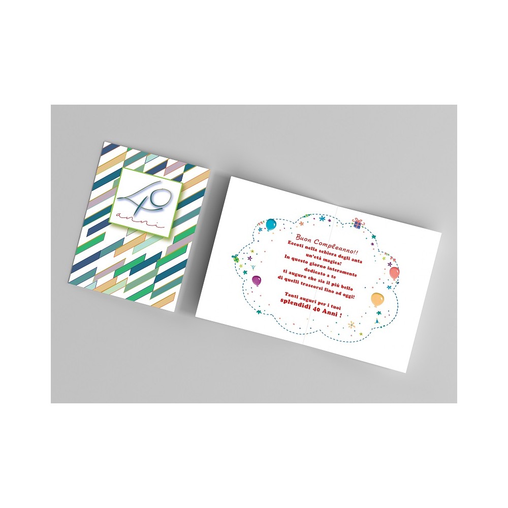 Ideale accessorio di cartoleria confezionato singolarmente da utilizzare nel giorno del 40° Compleanno di un famigliare, un amico o un collega, il prodotto, in cartoncino biodegradabile e completamente Made in Italy, viene presentato con una stampa serigrafica in rilievo della cifra 40 e all'interno del biglietto, troveremo il messaggio di auguri che cita "Buon Compleanno! Eccoti nella schiera degli anta, un'età magica! In questo giorno interamente dedicato a te ti auguro che sia il più bello di quelli trascorsi fino ad oggi! Tanti auguri per i tuoi splendidi 40 anni!" personalizzabile andando a scrivere il nome dei festeggiati. Ideale oggetto prodotto artigianalmente da abbinare eventualmente ad un regalo o a un mazzo di fiori.