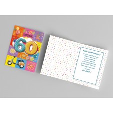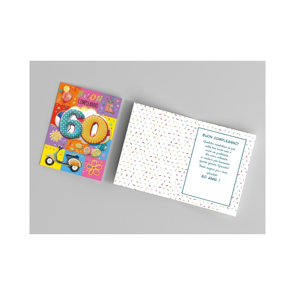 Ideale accessorio di cartoleria confezionato singolarmente da utilizzare nel giorno del 60° Compleanno di un famigliare, un amico o un collega, il prodotto, in cartoncino biodegradabile e completamente Made in Italy, viene presentato con una stampa serigrafica in rilievo con scritto "Buon Compleanno" e all'interno del biglietto, sarà perfetto personalizzare il tutto andando a scrivere il nome dei festeggiati di fianco al messaggio di auguri "Pensa Positivo, come il vino con il tempo migliori sempre di più... Tanti Auguri per i tuoi splendidi 60 Anni". Ideale oggetto prodotto artigianalmente da abbinare eventualmente ad un regalo o a un mazzo di fiori.