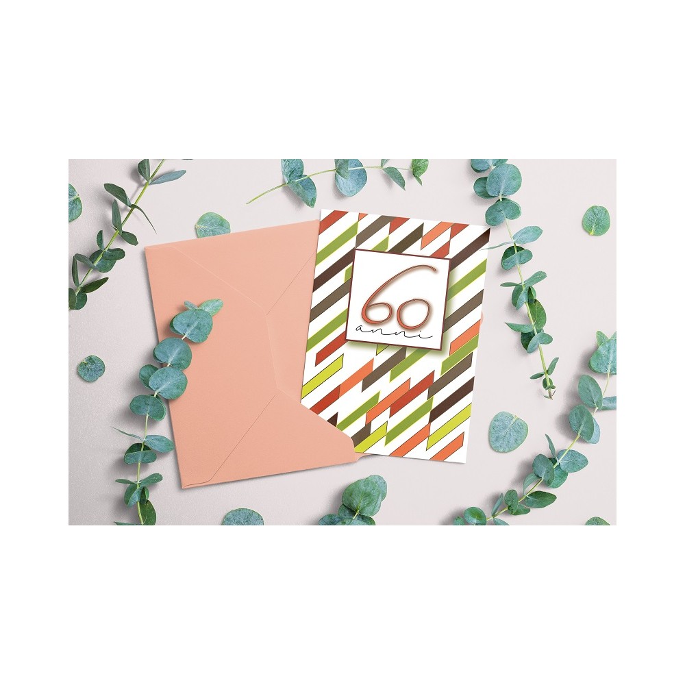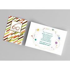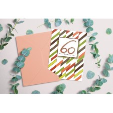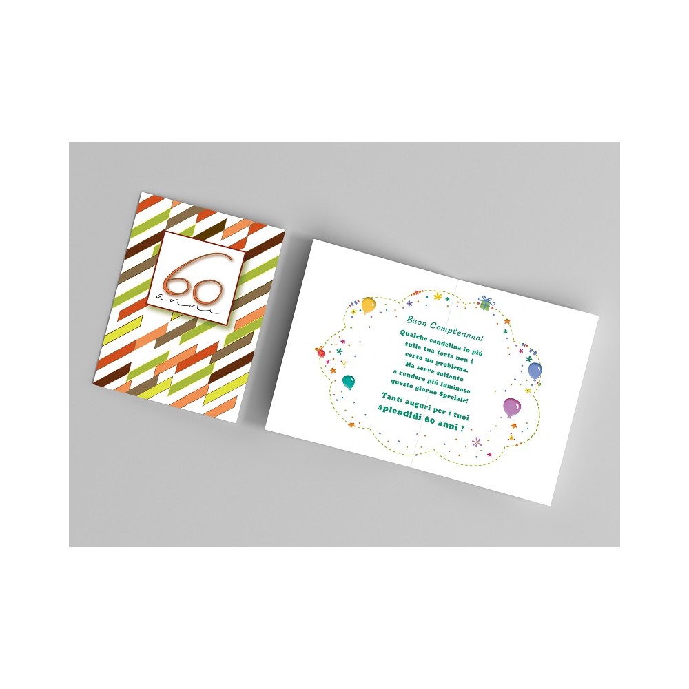 Ideale accessorio di cartoleria confezionato singolarmente da utilizzare nel giorno del 60° Compleanno di un famigliare, un amico o un collega, il prodotto, in cartoncino biodegradabile e completamente Made in Italy, viene presentato con una stampa serigrafica in rilievo della cifra 60 e all'interno del biglietto, troveremo il messaggio di auguri che cita "Buon Compleanno! Qualche candelina in più sulla tua torta non è certo un problema. Ma serve soltanto a rendere più luminoso questo giorno Speciale! Tanti auguri per i tuoi splendidi 60 anni!" personalizzabile andando a scrivere il nome dei festeggiati. Ideale oggetto prodotto artigianalmente da abbinare eventualmente ad un regalo o a un mazzo di fiori.