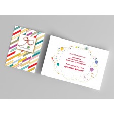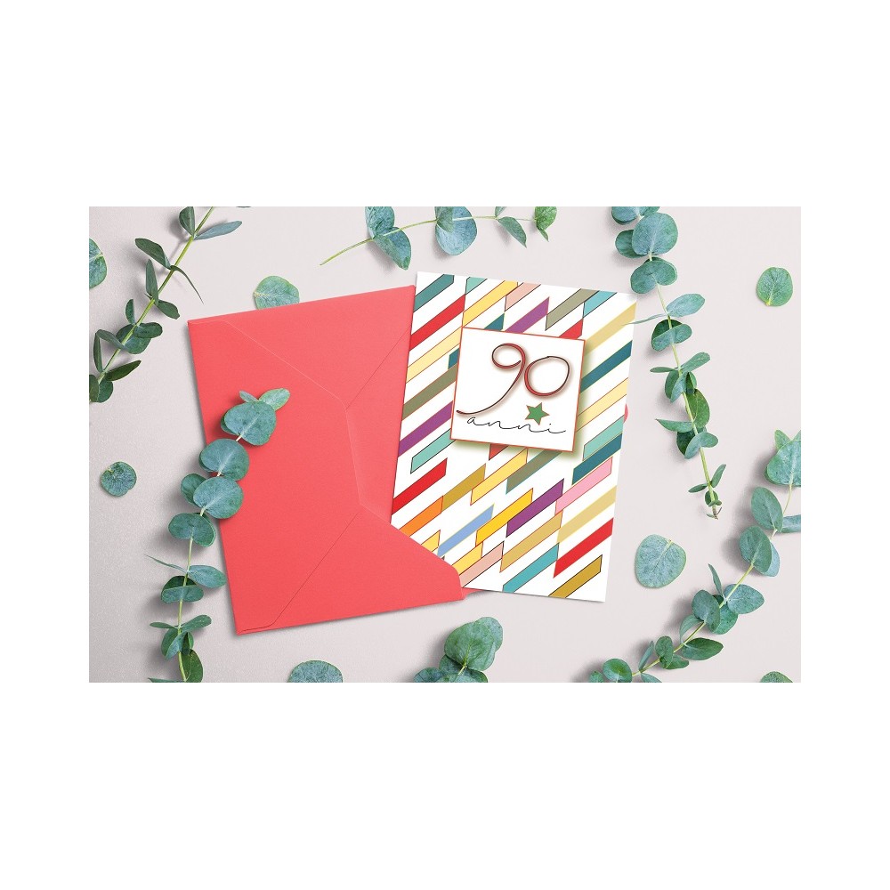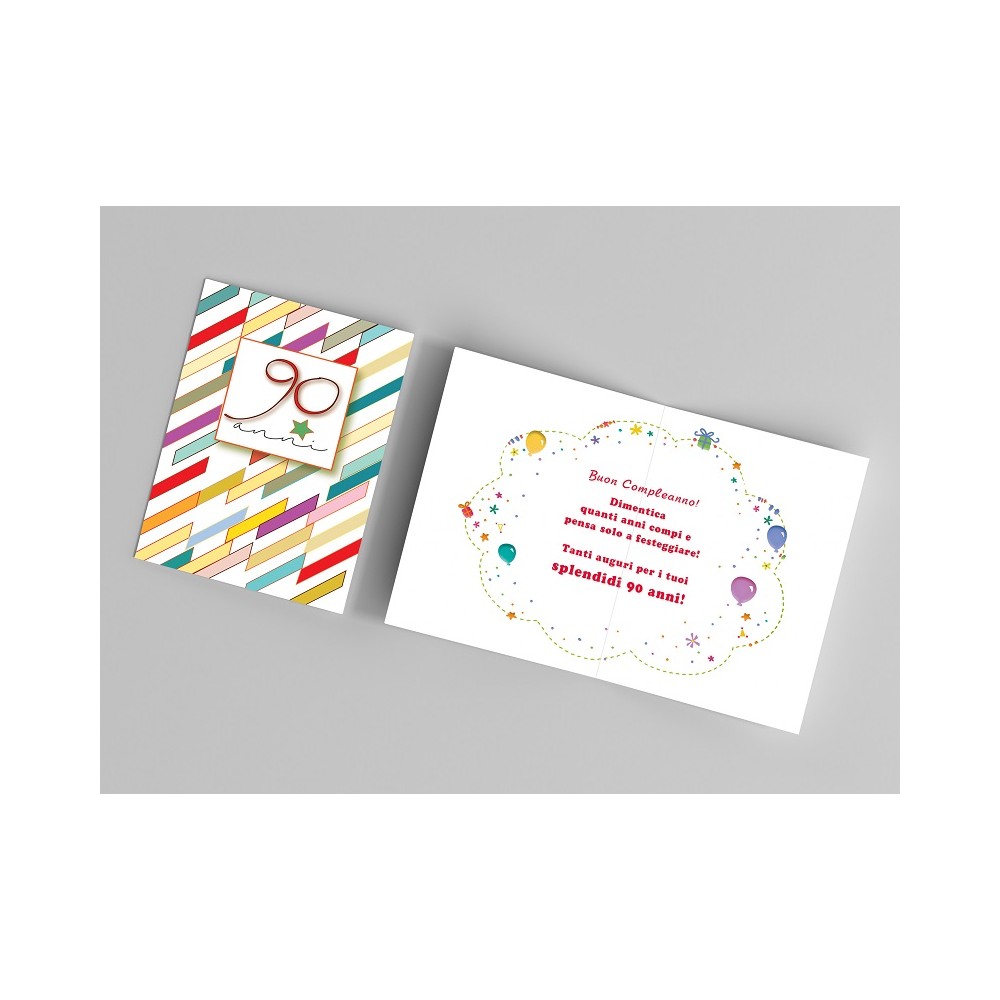 Ideale accessorio di cartoleria confezionato singolarmente da utilizzare nel giorno del 90° Compleanno di un famigliare, un amico o un collega, il prodotto, in cartoncino biodegradabile e completamente Made in Italy, viene presentato con una stampa serigrafica in rilievo della cifra 90 e all'interno del biglietto, troveremo il messaggio di auguri che cita "Buon Compleanno! Dimentica quanti anni compi e pensa solo a festeggiare! Tanti auguri per i tuoi splendidi 90 anni!" personalizzabile andando a scrivere il nome dei festeggiati. Ideale oggetto prodotto artigianalmente da abbinare eventualmente ad un regalo o a un mazzo di fiori.