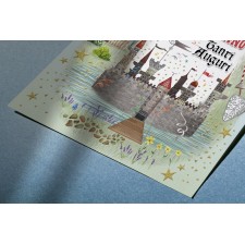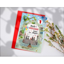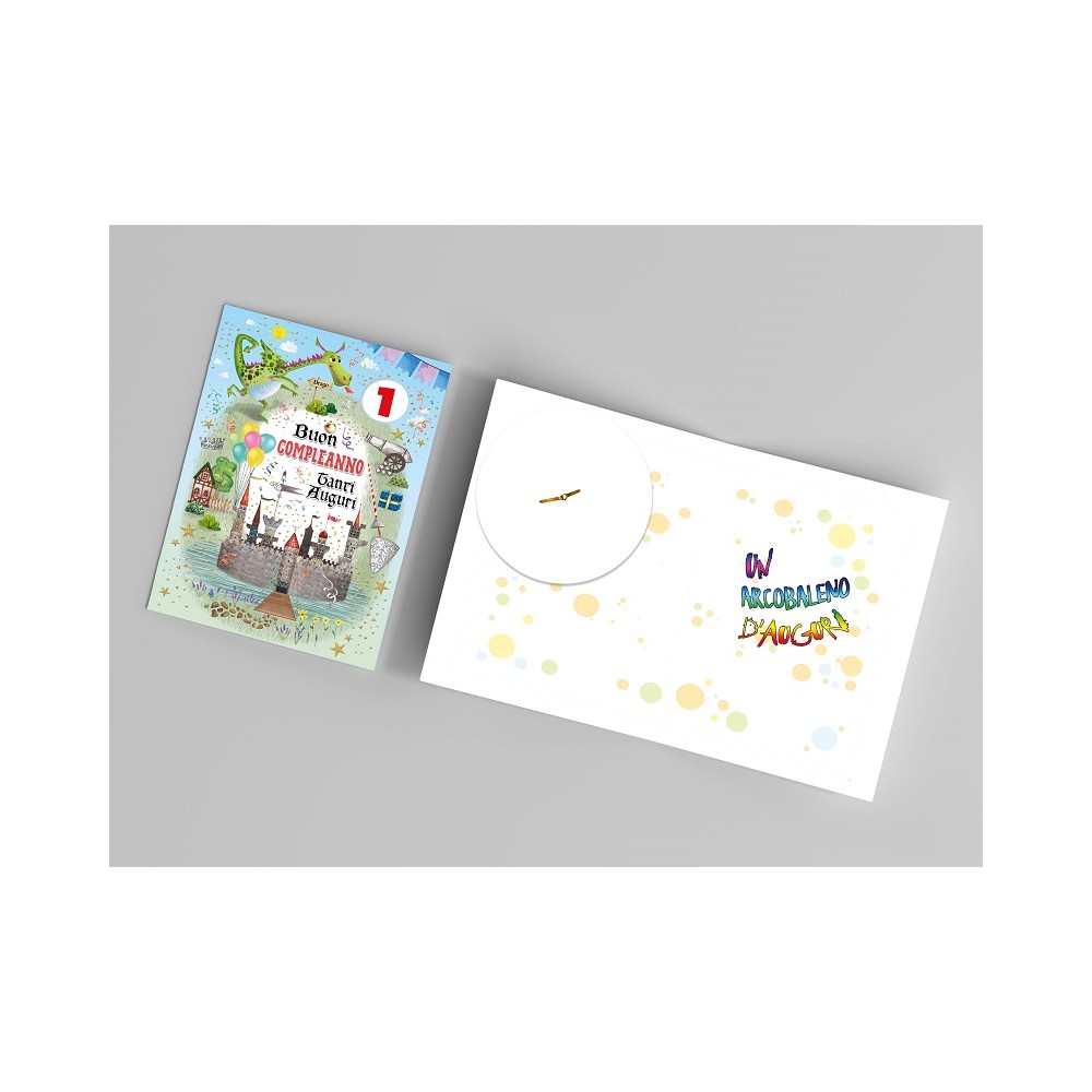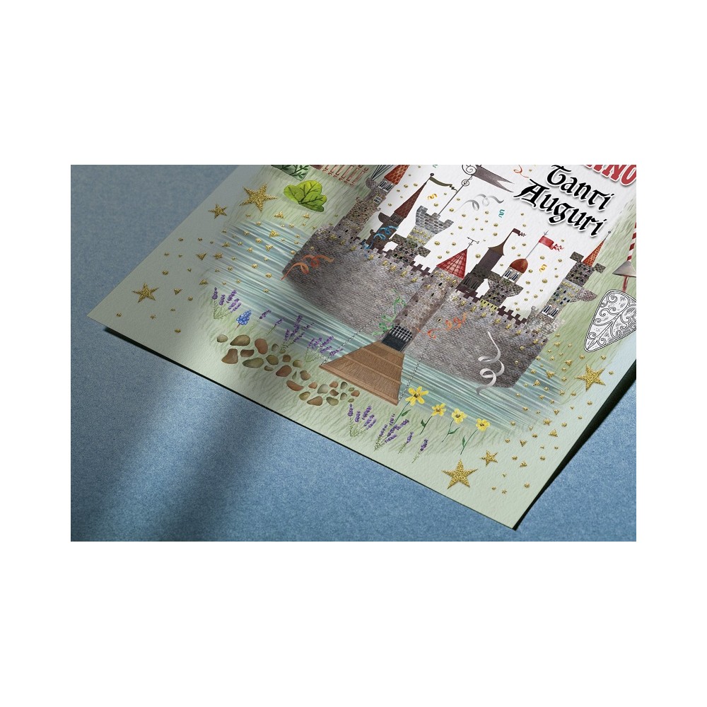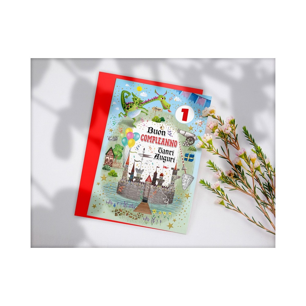 Biglietto "Buon Compleanno" castello drago con busta per bambini