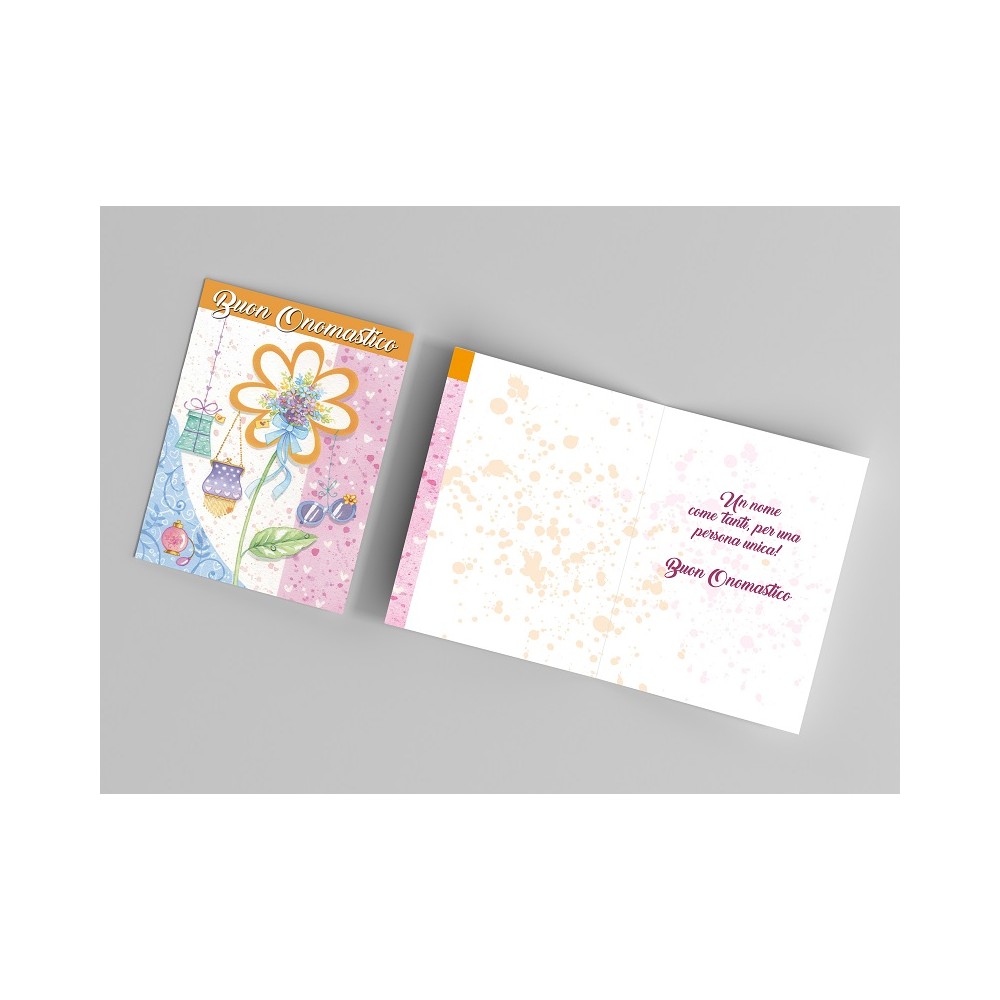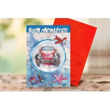 Ideale accessorio di cartoleria confezionato singolarmente da utilizzare nel giorno dell'Onomastico di un famigliare, un amico o un collega, il prodotto, in cartoncino biodegradabile e completamente Made in Italy, viene presentato con una stampa serigrafica glitterata di un Maggiolone e all'interno del biglietto, troveremo il messaggio di auguri che cita "Un nome come tanti, per una persona unica" personalizzabile andando a scrivere il nome del festeggiato. Ideale oggetto prodotto artigianalmente da abbinare eventualmente ad un regalo o a un mazzo di fiori.