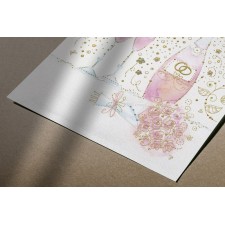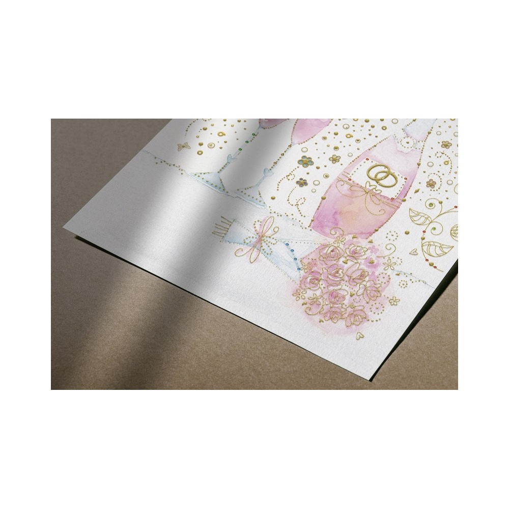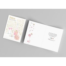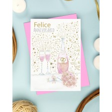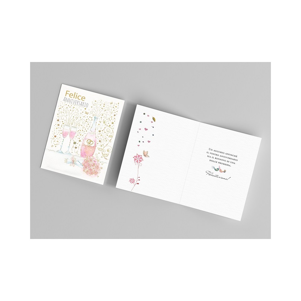 Ideale accessorio di cartoleria confezionato singolarmente da utilizzare nel giorno dell' Anniversario di Nozze di un famigliare, un amico o un collega, il prodotto, in cartoncino biodegradabile e completamente Made in Italy, viene presentato con una stampa in rilievo di una bottiglia di Rosè e le sue flutes accompagnate dalla scritta "Felice Anniversario" decorata con Oro a Caldo e all'interno del biglietto, troveremo il messaggio di auguri che cita "Con l'augurio che l'amore e la felicità siano sempre più grandi" personalizzabile andando a scrivere il nome dei festeggiati. Ideale oggetto prodotto artigianalmente da abbinare eventualmente ad un regalo o a un mazzo di fiori.