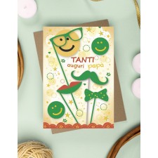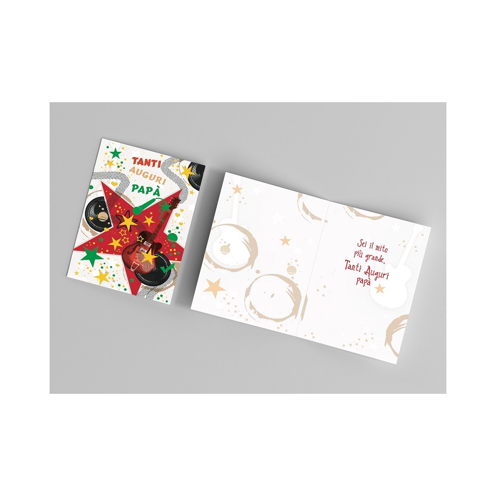 Ideale accessorio di cartoleria confezionato singolarmente da utilizzare nel giorno della Festa del Papà, il prodotto, in cartoncino biodegradabile e completamente Made in Italy, viene presentato con una stampa serigrafica in rilievo accompagnate dalla scritta "Tanti Auguri Papà" e all'interno del biglietto, troveremo il messaggio di auguri che cita "Tanti Auguri ad un papà molto, molto speciale" personalizzabile andando a scrivere il nome del festeggiato. Ideale oggetto prodotto artigianalmente da abbinare eventualmente ad un regalo o a un mazzo di fiori.