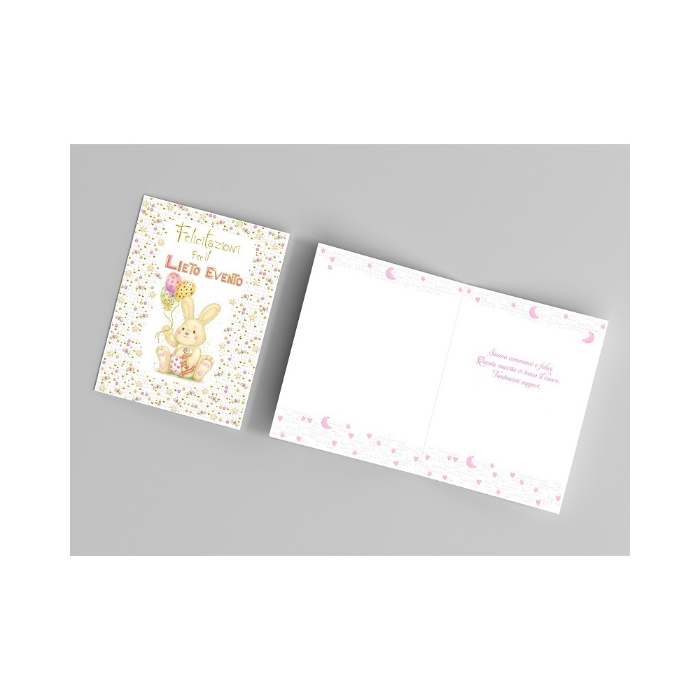 Ideale accessorio di cartoleria confezionato singolarmente da utilizzare nel giorno della Nascita diun Bimbo di un famigliare, un amico o un collega, il prodotto, in cartoncino biodegradabile e completamente Made in Italy, viene presentato con una stampa serigrafica in rilievo di un Coniglietto Rosa accompagnate dalla scritta "Felicitazioni per il Lieto Evento" e all'interno del biglietto, troveremo il messaggio di auguri che cita "Siamo commossi e felici. Questa nascita ci tocca il cuore. Tantissimi Auguri" personalizzabile andando a scrivere il nome del festeggiato. Ideale oggetto prodotto artigianalmente da abbinare eventualmente ad un regalo o a un mazzo di fiori.
