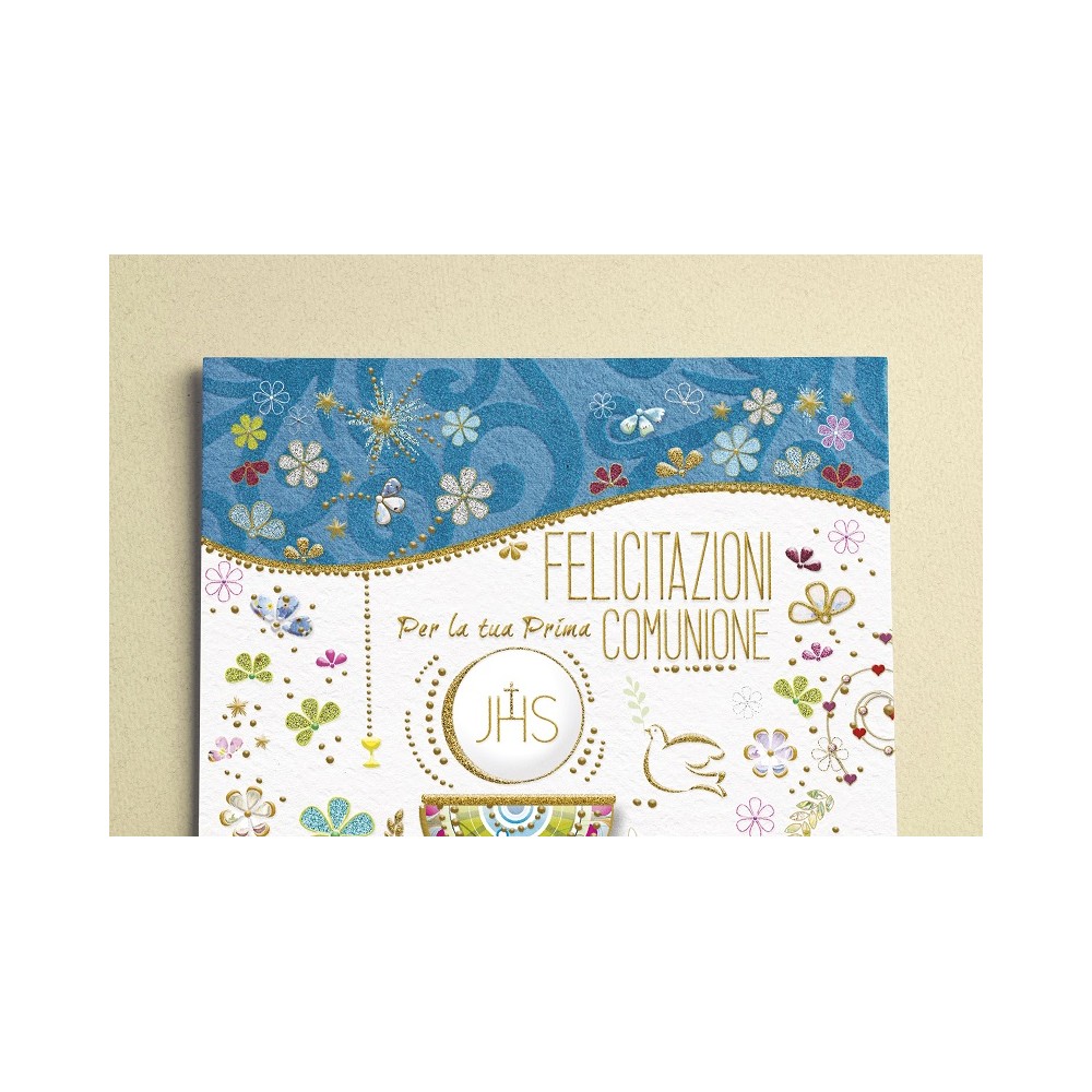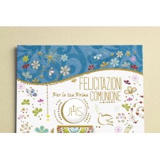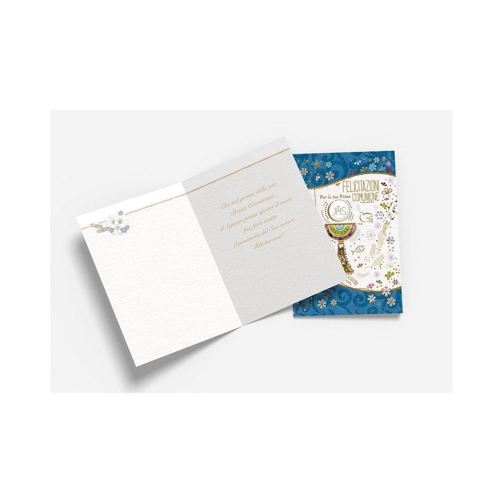 Ideale accessorio di cartoleria confezionato singolarmente da utilizzare nel giorno della Prima Comunione di un famigliare, un amico o un collega, il prodotto, in cartoncino biodegradabile e completamente Made in Italy, viene presentato con una stampa serigrafica in rilievo con scritto "Felicitazioni per la tua Prima Comunione" e all'interno del biglietto, sarà perfetto personalizzare il tutto andando a scrivere il nome dei festeggiati di fianco al messaggio di auguri "Che nel giorno della tua Prima Comunione il Signore possa aprirti il cuore per farti sentir l'immensità del Suo amore. Felicitazioni! ". Ideale oggetto prodotto artigianalmente da abbinare eventualmente ad un regalo o a un mazzo di fiori.