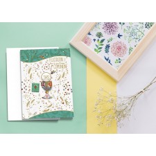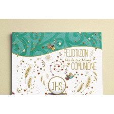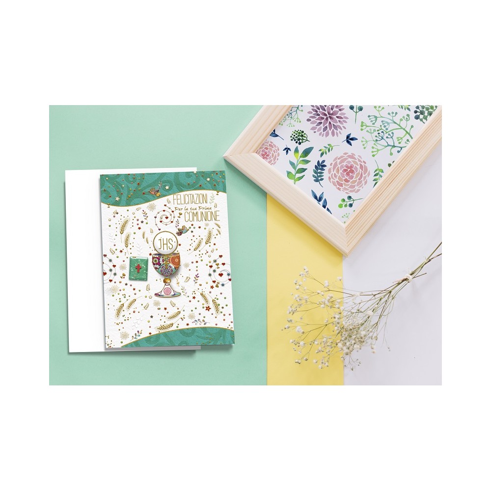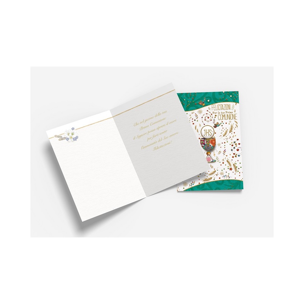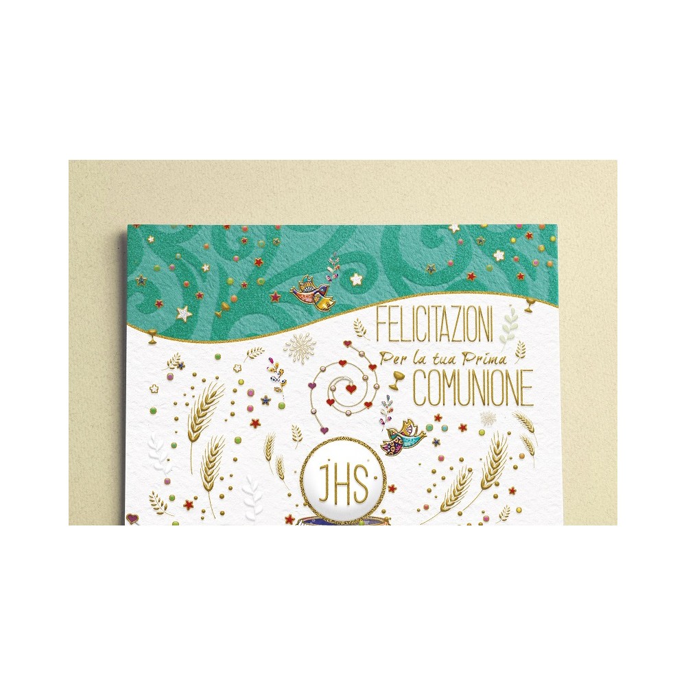 Ideale accessorio di cartoleria confezionato singolarmente da utilizzare nel giorno della Prima Comunione di un famigliare, un amico o un collega, il prodotto, in cartoncino biodegradabile e completamente Made in Italy, viene presentato con una stampa serigrafica in rilievo con scritto "Felicitazioni per la tua Prima Comunione" e all'interno del biglietto, sarà perfetto personalizzare il tutto andando a scrivere il nome dei festeggiati di fianco al messaggio di auguri "Che nel giorno della tua Prima Comunione il Signore possa aprirti il cuore per farti sentir l'immensità del Suo amore. Felicitazioni! ". Ideale oggetto prodotto artigianalmente da abbinare eventualmente ad un regalo o a un mazzo di fiori.