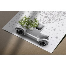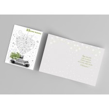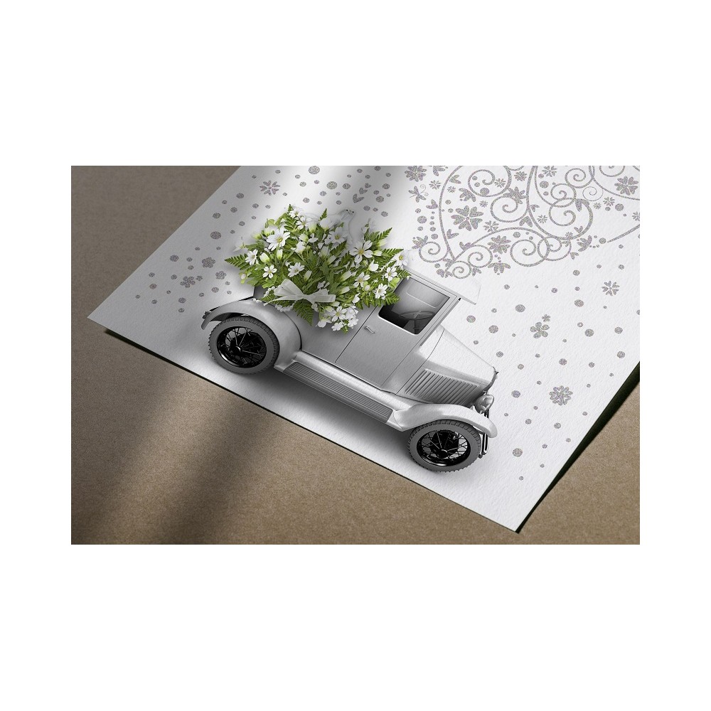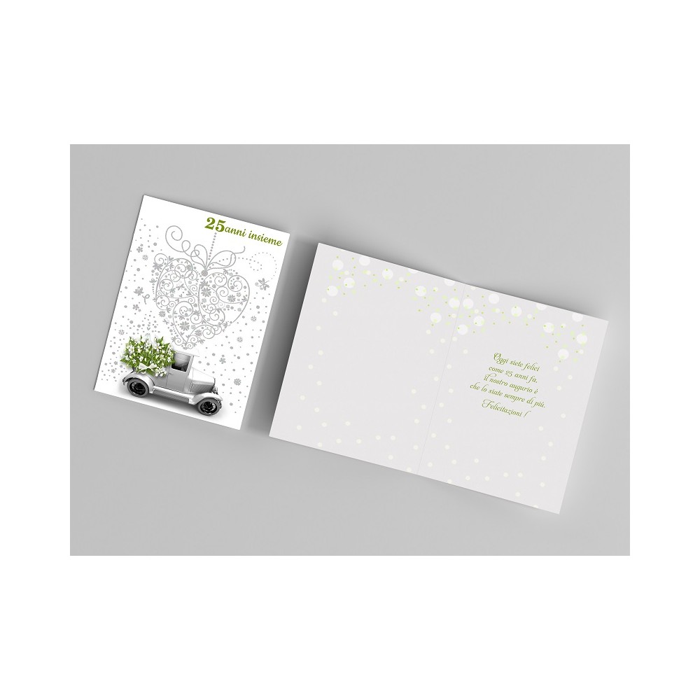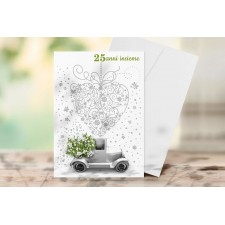 Ideale accessorio di cartoleria confezionato singolarmente da utilizzare nel giorno dei 25 Anni di Matrimonio di un famigliare, un amico o un collega, il prodotto, in cartoncino biodegradabile e completamente Made in Italy, viene presentato con una stampa serigrafica in rilievo di una automobile che trasporta un enorme mazzo di fiori accompagnate dalla scritta "Felice Anniversario" e all'interno del biglietto, troveremo il messaggio di auguri che cita "Non c'è niente di più bello di un amore che dura per sempre" personalizzabile andando a scrivere il nome dei festeggiati. Ideale oggetto prodotto artigianalmente da abbinare eventualmente ad un regalo o a un mazzo di fiori.