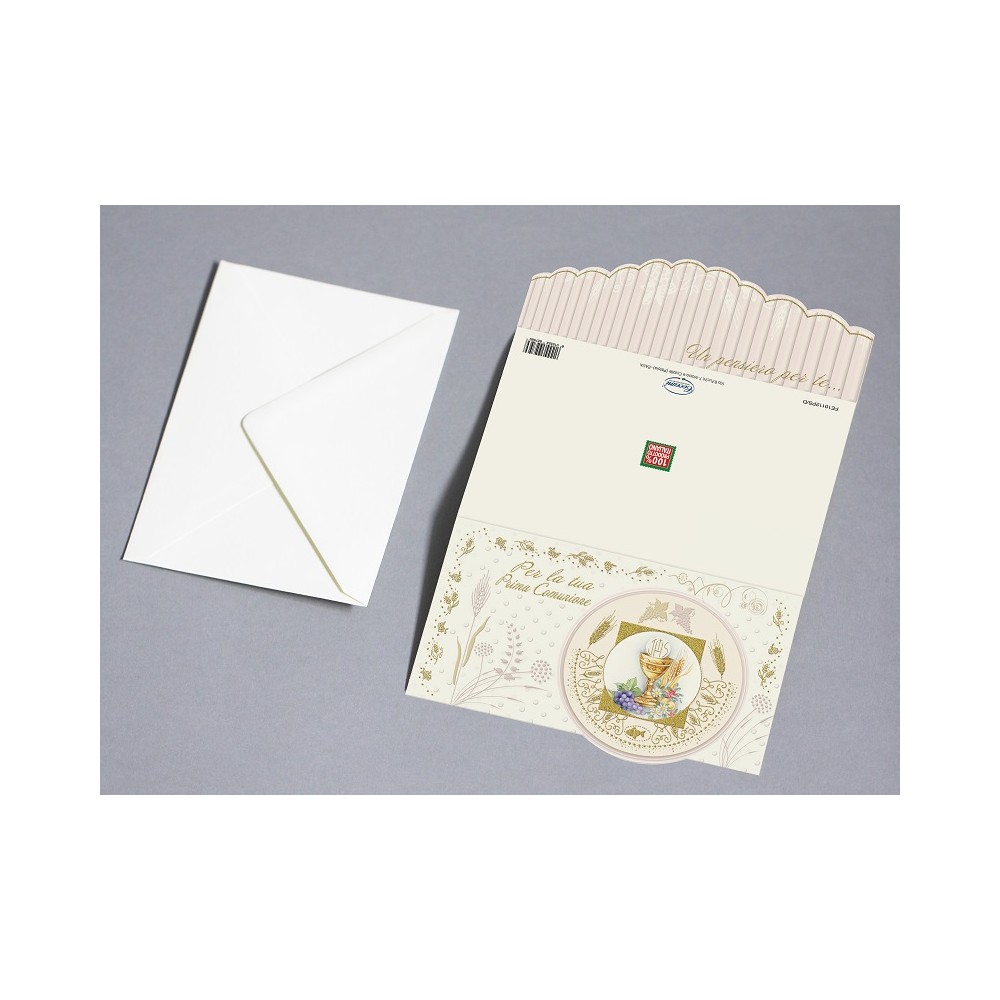 Ideale accessorio di cartoleria confezionato singolarmente da utilizzare nel giorno della Comunione di un famigliare, un amico o un collega, il prodotto, in cartoncino biodegradabile e completamente Made in Italy, viene presentato come Biglietto Portasoldi con la stampa "Per la tua prima Comunione" personalizzabile andando a scrivere il nome dei festeggiati. Ideale oggetto prodotto artigianalmente da abbinare eventualmente ad un regalo o a un mazzo di fiori.