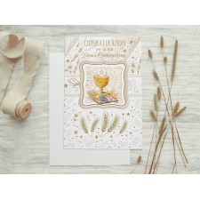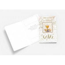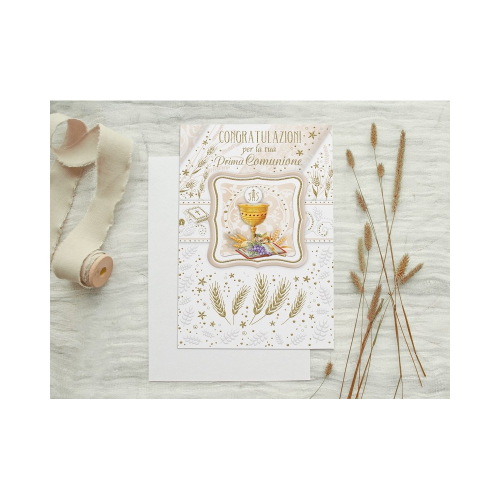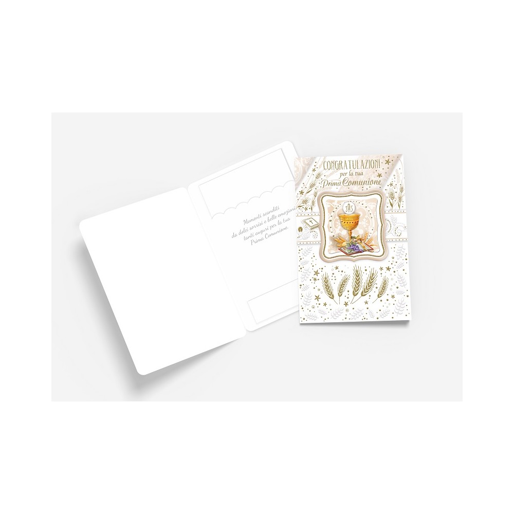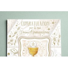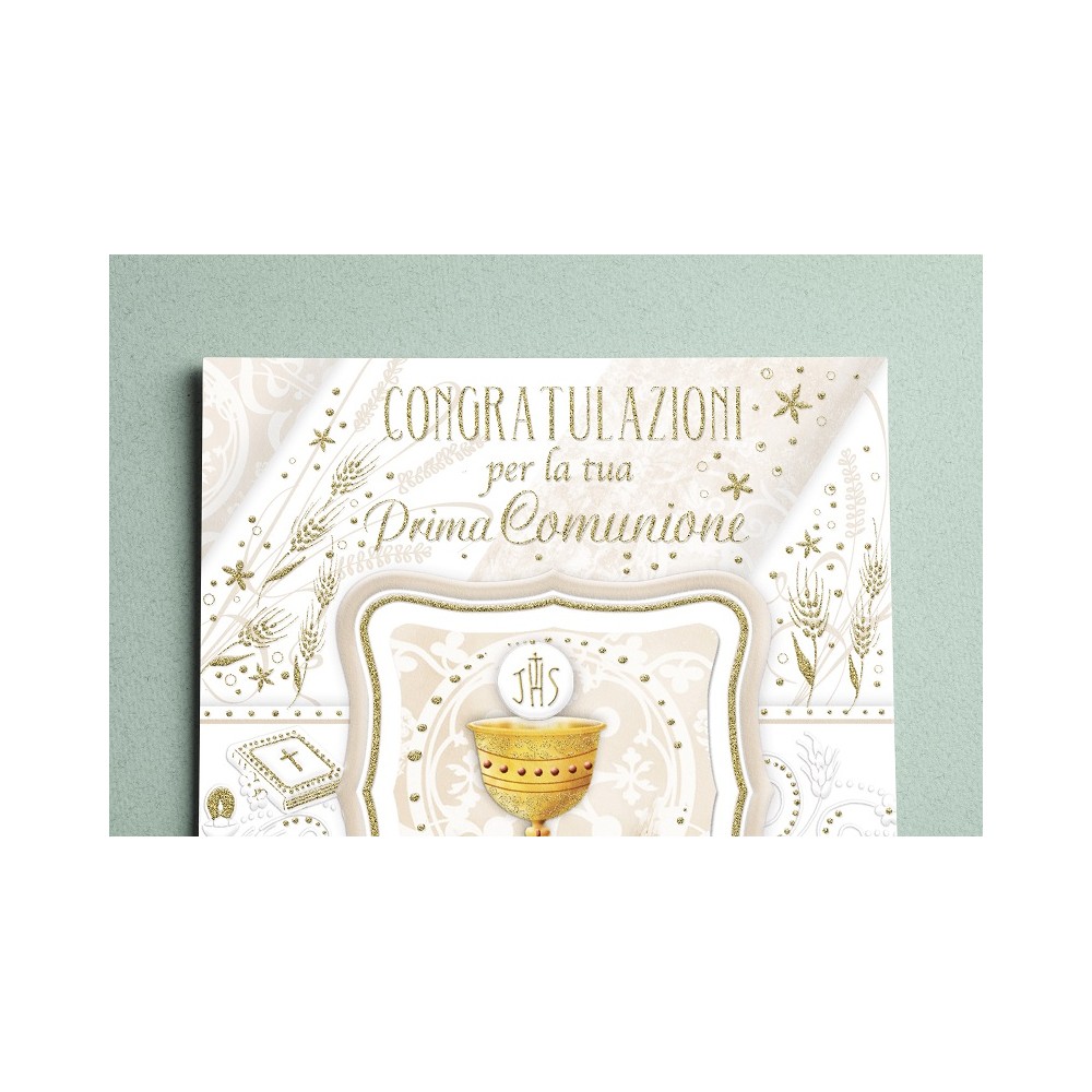Ideale accessorio di cartoleria confezionato singolarmente da utilizzare nel giorno della Prima Comunione di un famigliare, un amico o un collega, il prodotto, in cartoncino biodegradabile e completamente Made in Italy, viene presentato con una stampa serigrafica in rilievo con scritto "Congratulazioni per la tua Prima Comunione" e all'interno del biglietto, sarà perfetto personalizzare il tutto andando a scrivere il nome dei festeggiati di fianco al messaggio di auguri "Momenti scanditi da dolci sorrisi e belle emozioni, tanti auguri per la tua Prima Comunione". Ideale oggetto prodotto artigianalmente da abbinare eventualmente ad un regalo o a un mazzo di fiori.