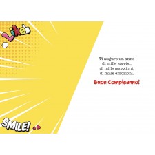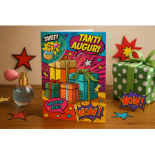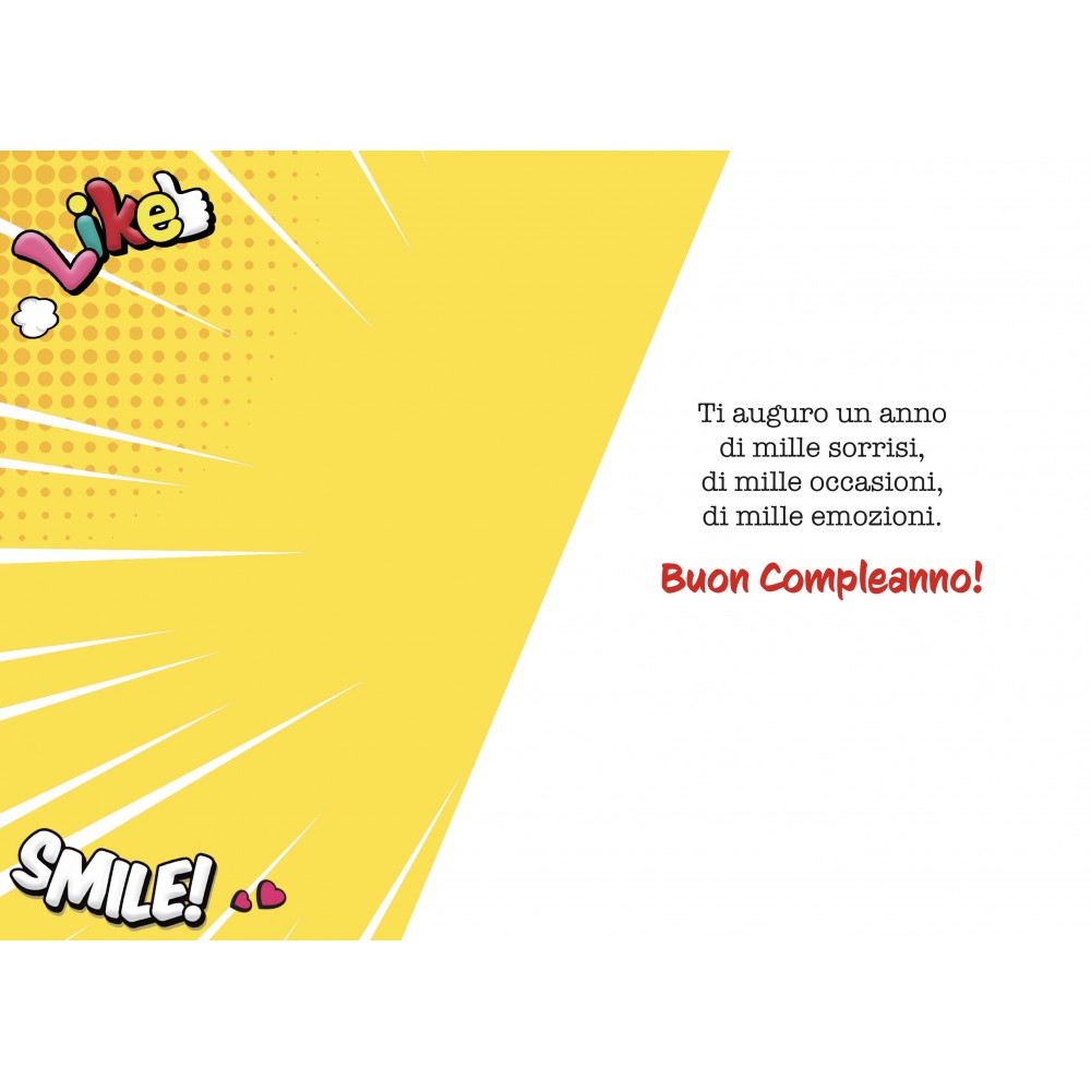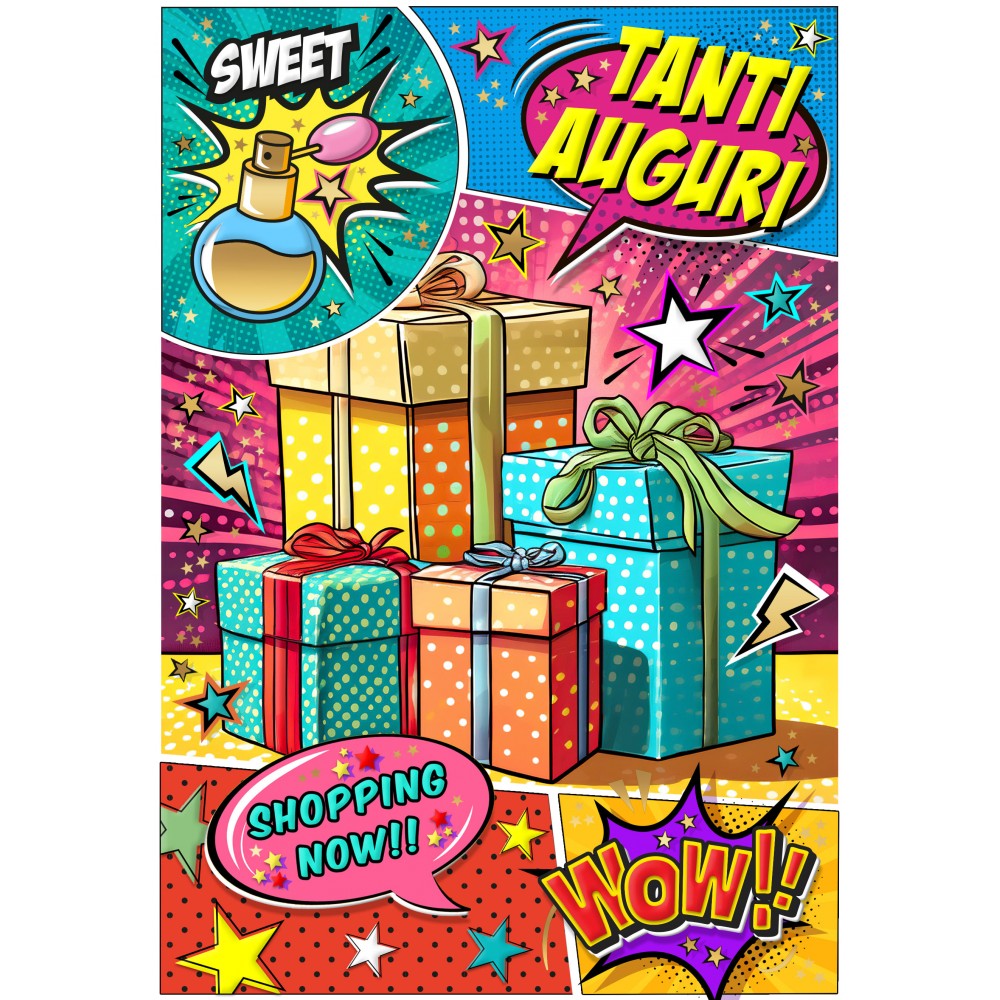 Ideale accessorio di cartoleria confezionato singolarmente. Vivace biglietto d’auguri in stile fumetto, ricco di colori ed elementi pop-art. Con pacchetti regalo, dettagli dinamici e frasi espressive, è perfetto per portare allegria in qualsiasi occasione speciale.