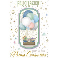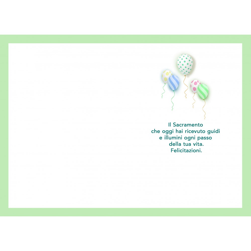Ideale accessorio di cartoleria confezionato singolarmente. Un delicato biglietto d’auguri per la Prima Comunione, ispirato a questo momento speciale di fede e gioia. Con disegnati palloncini e un design armonioso, esprime affetto e augura serenità e benedizioni in questo giorno indimenticabile.