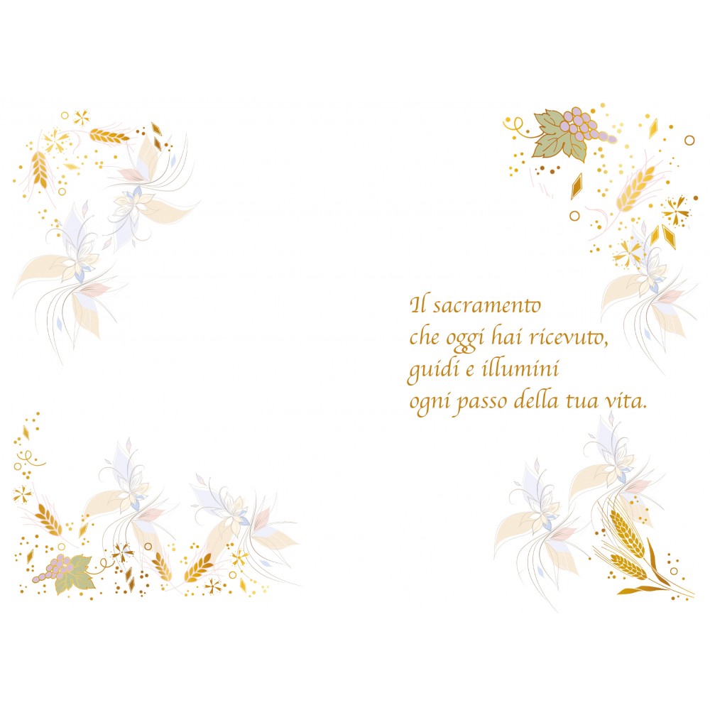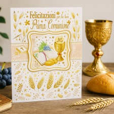 Ideale accessorio di cartoleria confezionato singolarmente. Un delicato biglietto d’auguri per la Prima Comunione, ispirato a questo momento speciale di fede e gioia. Con simboli religiosi e un design armonioso, esprime affetto e augura serenità e benedizioni in questo giorno indimenticabile.