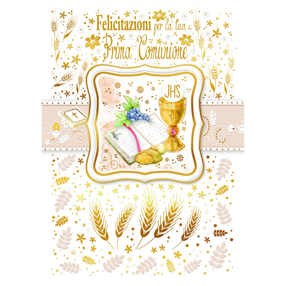 Biglietto Prima Comunione Felicitazioni JHS, con busta