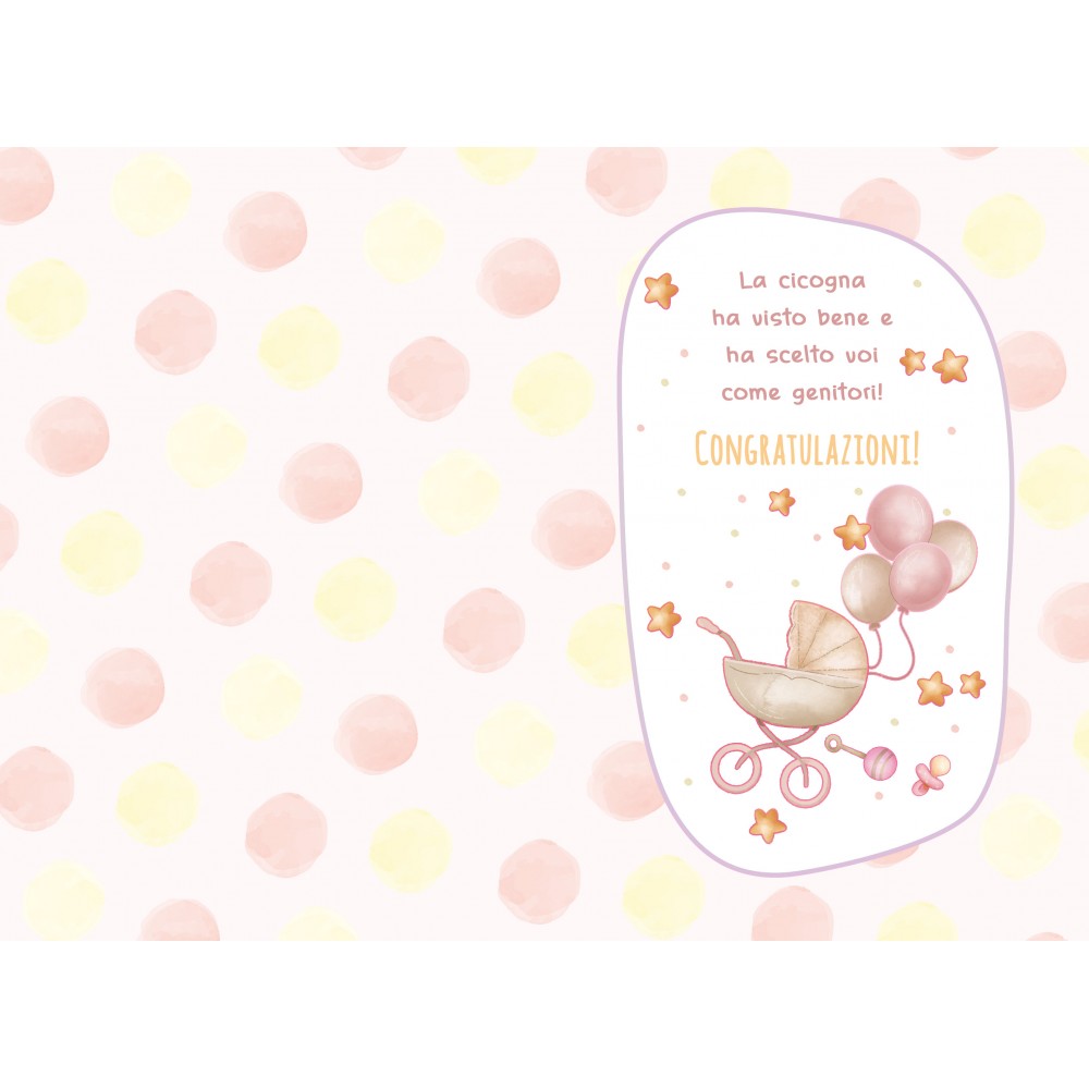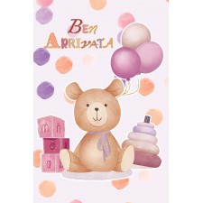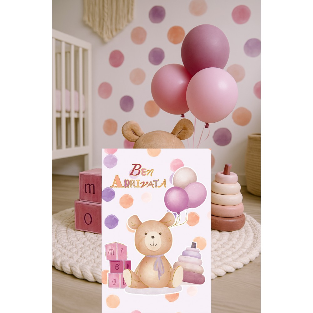 Tenero biglietto di benvenuto con un dolcissimo orsetto rosa e la scritta “Ben Arrivata”. Perfetto per festeggiare l’arrivo di una neonata con affetto e dolcezza, ideale per accompagnare un regalo speciale.