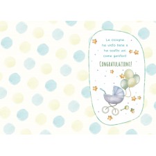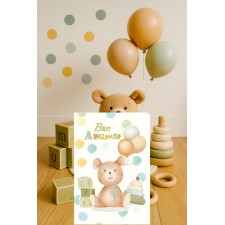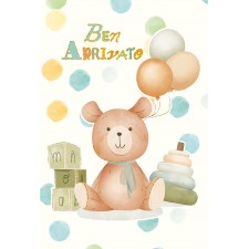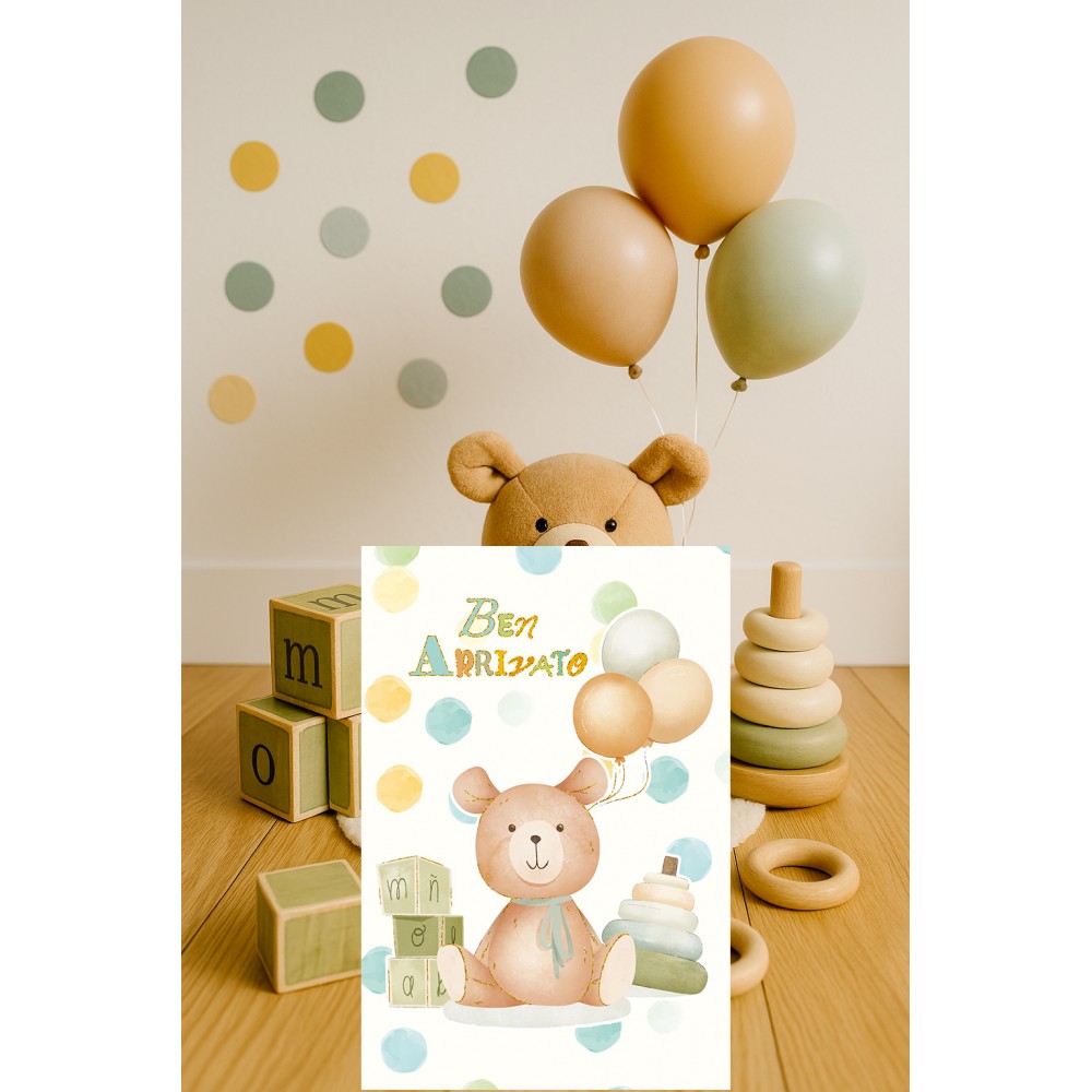 Tenero biglietto di benvenuto con un dolcissimo orsetto azzurro e la scritta “Ben Arrivato”. Perfetto per festeggiare l’arrivo di un neonato con affetto e dolcezza, ideale per accompagnare un regalo speciale.