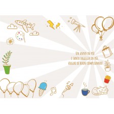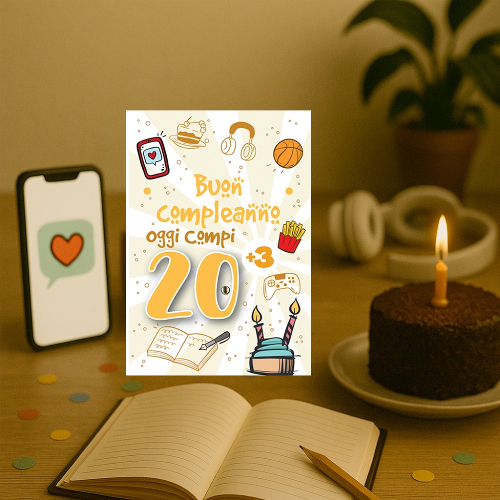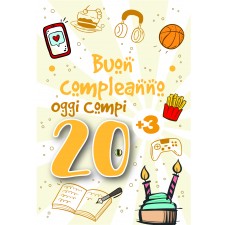 Biglietto di auguri vivace e colorato, ideale per festeggiare un compleanno con allegria. Con curiosi oggetti disegnati da "giovanotto" e la simpatica scritta “20+3”, è perfetto per rendere speciale il giorno di un ragazzo o una ragazza.