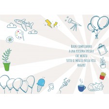 Biglietto di auguri vivace e colorato, ideale per festeggiare un compleanno con allegria. Con curiosi oggetti disegnati e la simpatica scritta “30+4”, è perfetto per rendere speciale il giorno di un ragazzo o una ragazza.
