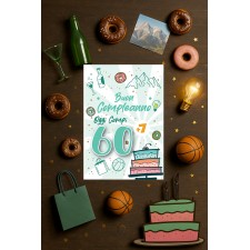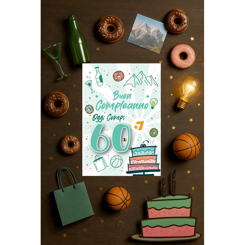 Biglietto di auguri vivace e colorato, ideale per festeggiare un compleanno con allegria. Con curiosi oggetti disegnati e la simpatica scritta “60+7”, è perfetto per rendere speciale il giorno di un giovanissimo o giovanissima!!!