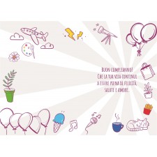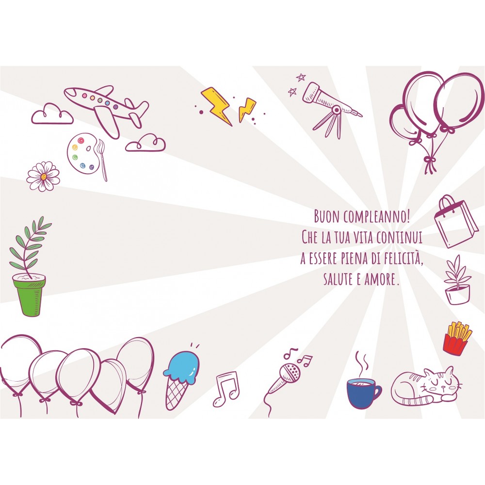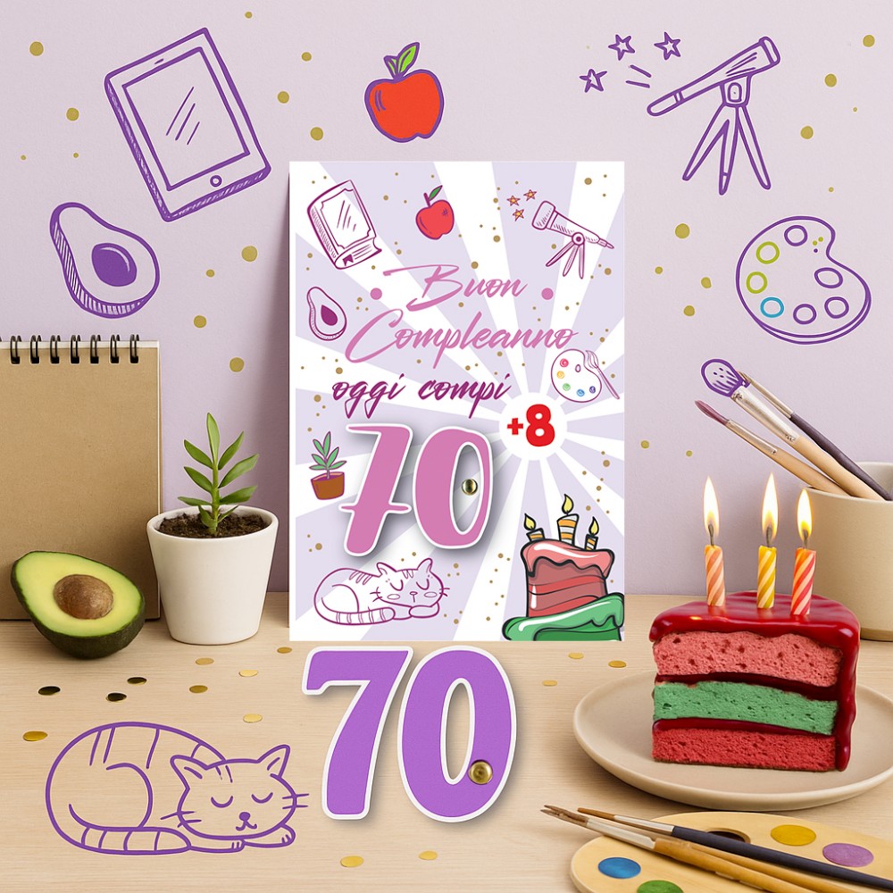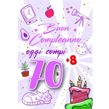 Biglietto di auguri vivace e colorato, ideale per festeggiare un compleanno con allegria. Con curiosi oggetti disegnati e la simpatica scritta “70+8”, è perfetto per rendere speciale questa giornata unica!!!
