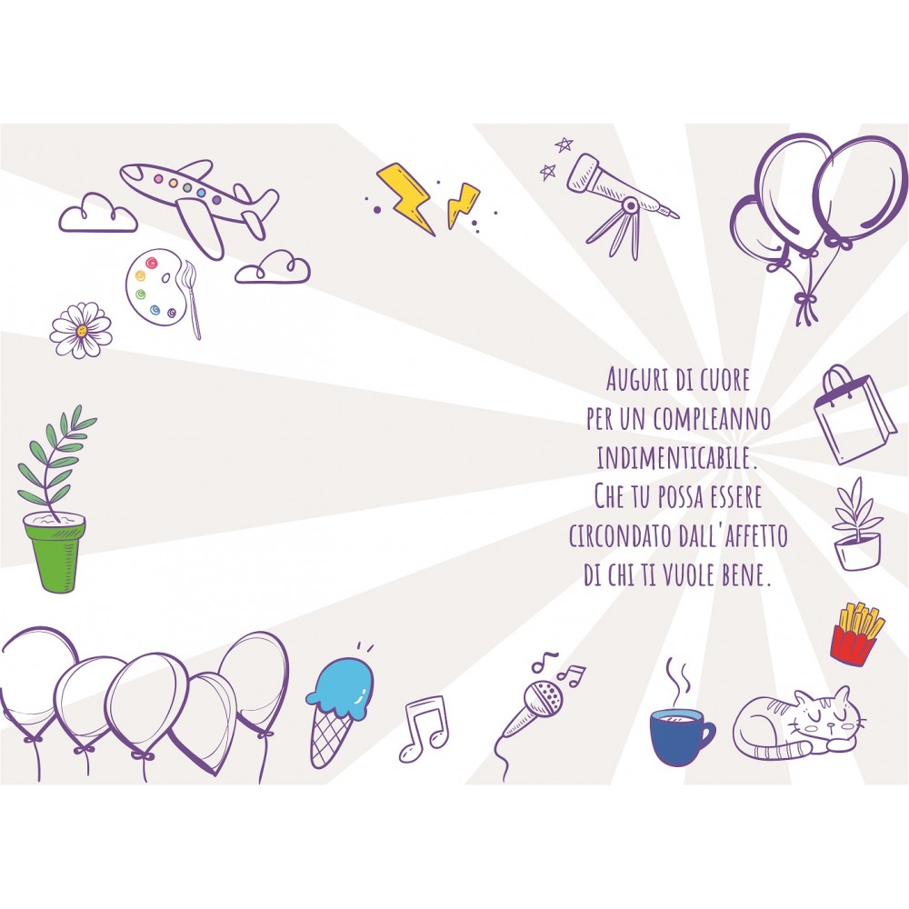 Biglietto di auguri vivace e colorato, ideale per festeggiare un compleanno con allegria. Con curiosi oggetti disegnati e la simpatica scritta “80+9”, è perfetto per rendere speciale la festa di un anziano o anziana.