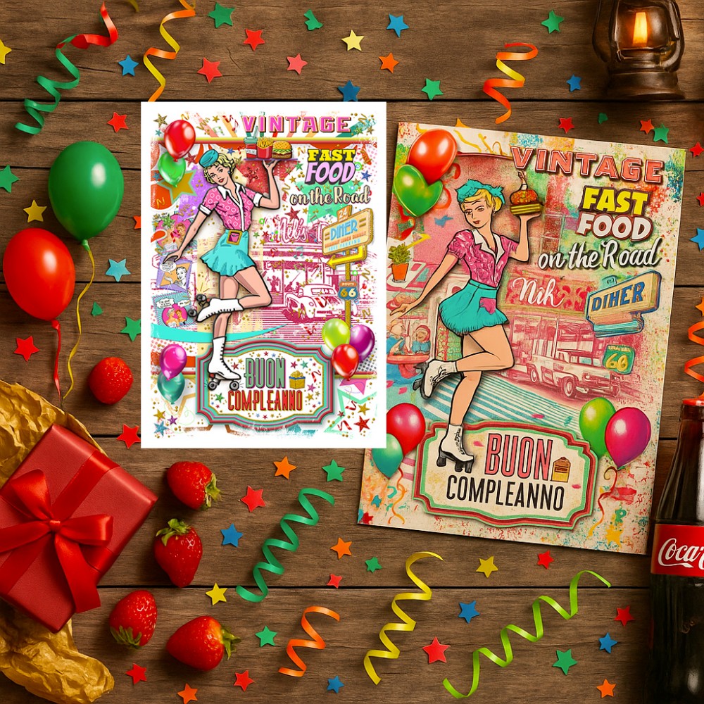 Biglietto di auguri in perfetto stile vintage anni ’50, ispirato ai classici diner americani. Colori vivaci, grafiche retrò e dettagli da fast food rendono la scritta “Buon Compleanno” ancora più divertente e originale. Perfetto per chi ama il fascino del rock ‘n’ roll e delle atmosfere old school.