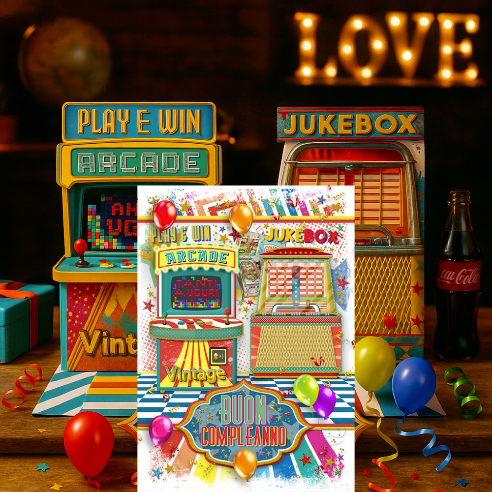 Biglietto di auguri in perfetto stile vintage anni ’50, ispirato ai classici Juke Box americani. Colori vivaci, grafiche retrò e dettagli unici rendono la scritta “Buon Compleanno” ancora più divertente e originale. Perfetto per chi ama il fascino del rock ‘n’ roll e delle atmosfere old school.