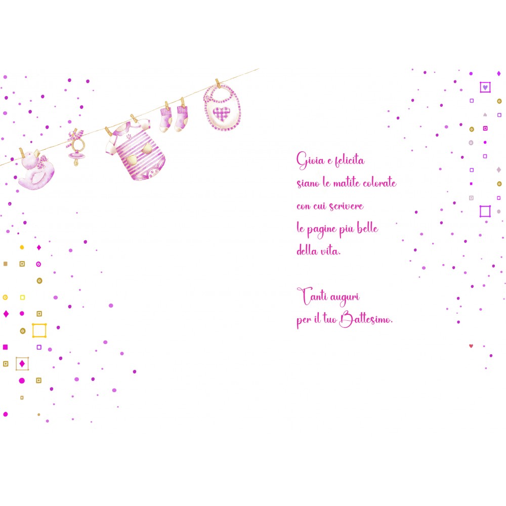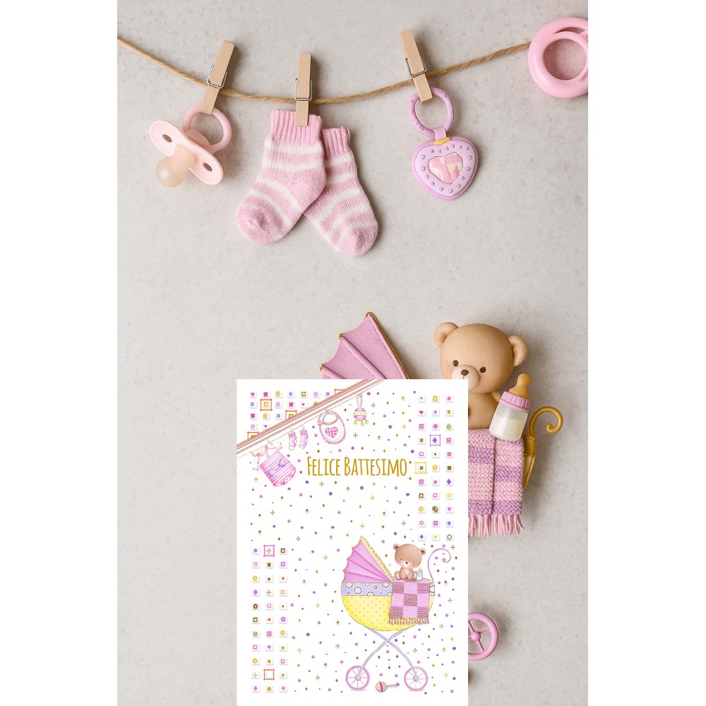 Dolce biglietto augurale per un felice battesimo, decorato con una tenera carrozzina rosa. Perfetto per celebrare con gioia l’arrivo di un bimbo e accompagnare un pensiero speciale in un giorno indimenticabile.