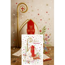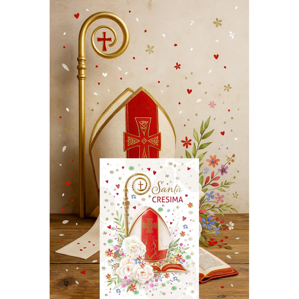 Biglietto augurale dedicato alla Santa Cresima, con simboli sacri. Elegante e significativo, è perfetto per celebrare questo importante sacramento con un messaggio di affetto e spiritualità.
