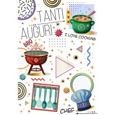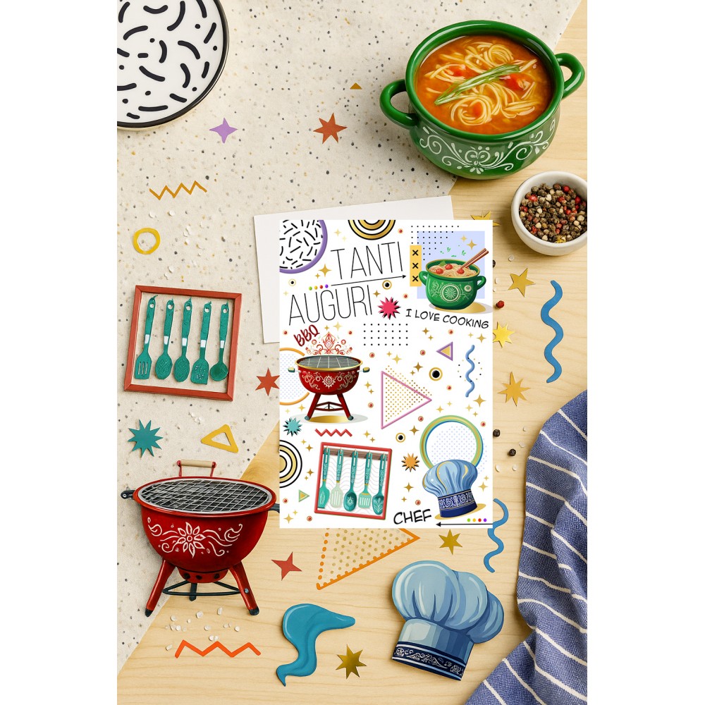 Biglietto di auguri gustoso e creativo, perfetto per chi ama cucinare. Decorato con utensili da cucina, dolci, piatti appetitosi e la scritta “Tanti AUGURI”, è l’ideale per festeggiare con un tocco di sapore e allegria.
