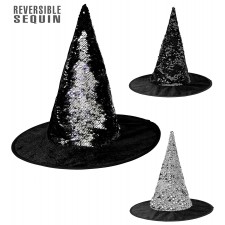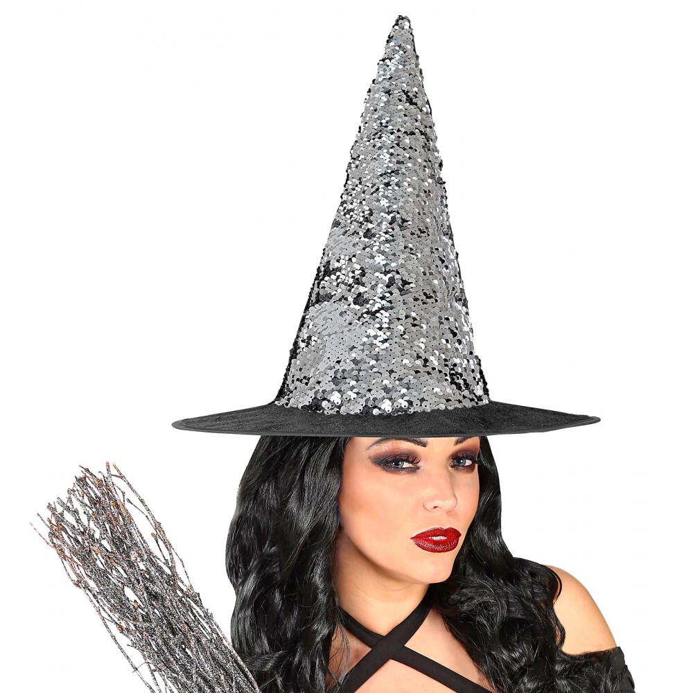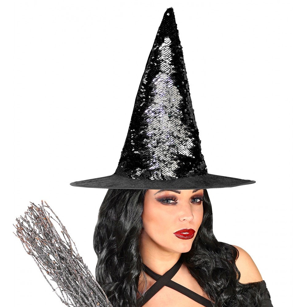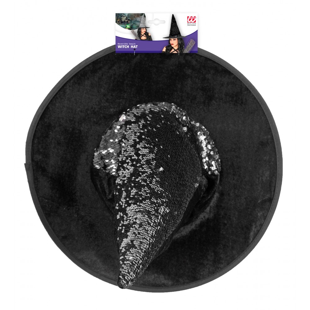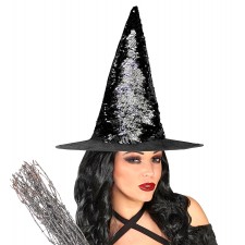 Completa il look da strega con questo splendido accessorio luccicante, con il cappello da strega reversibile puoi scegliere di avere un cappello con paillettes nero oppure argento, adatto per festa di Halloween, feste a tema oppure per l'epifania per impreziosire il tuo costume da befana, strega fashion.