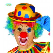 Cappello a bombetta da pagliaccio giallo con pois multicolore per feste