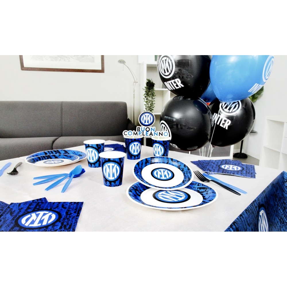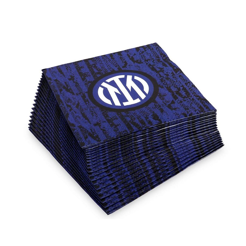 All'interno della confezione troverete 20 tovaglioli sul cui sfondo sono stampati i colori societari dell'Inter, nero e azzurro, invece al centro troverete una stella bianca bordata d'oro al cui interno è stato impresso lo stemma della squadra con il suo nome al di sotto mentre sul retro appare lo stesso disegno con l'eccezione che al centro è stata stampata la scritta "Forza Inter".