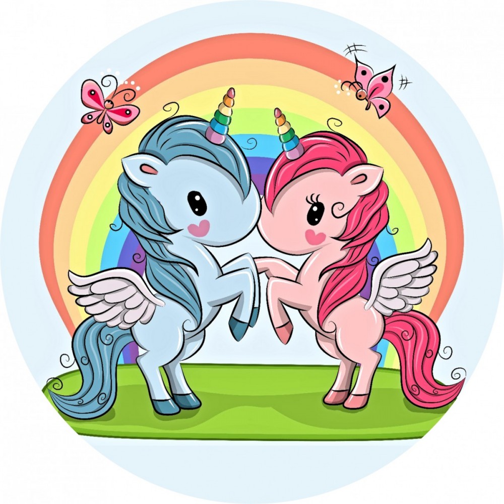 I soggetti di questa cialda sono due bellissimi unicorni, uno azzurro ed uno rosa, che sono impennati l'uno di fronte all'altro ed entrambi sono racchiusi da uno splendido e raggiante arcobaleno.