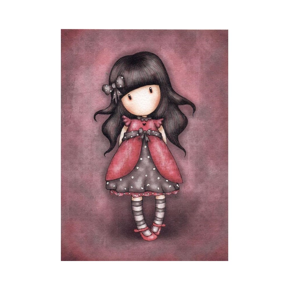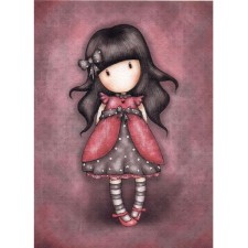 Il soggetto di questa cialda è il personaggio Gorjuss dell'azienda inglese Santoro London che in questa circostanza un bellissimo abitino fucsia con delle fantasie grigie a pois bianchi e delle calze a righe bianche e fucsia.
