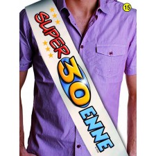 Ottimo accessorio utilizzabile in vista di una festa del trentesimo compleanno, l'articolo infatti, si presenta come fascia premio da indossare sotto spalla, presentata con la scritta "Super 30 enne", utile nel caso si decida di celebrare la festa in mezzo alla folla e utilizzare il gadget umoristico come riconoscimento del festeggiato tra tutti i presenti.