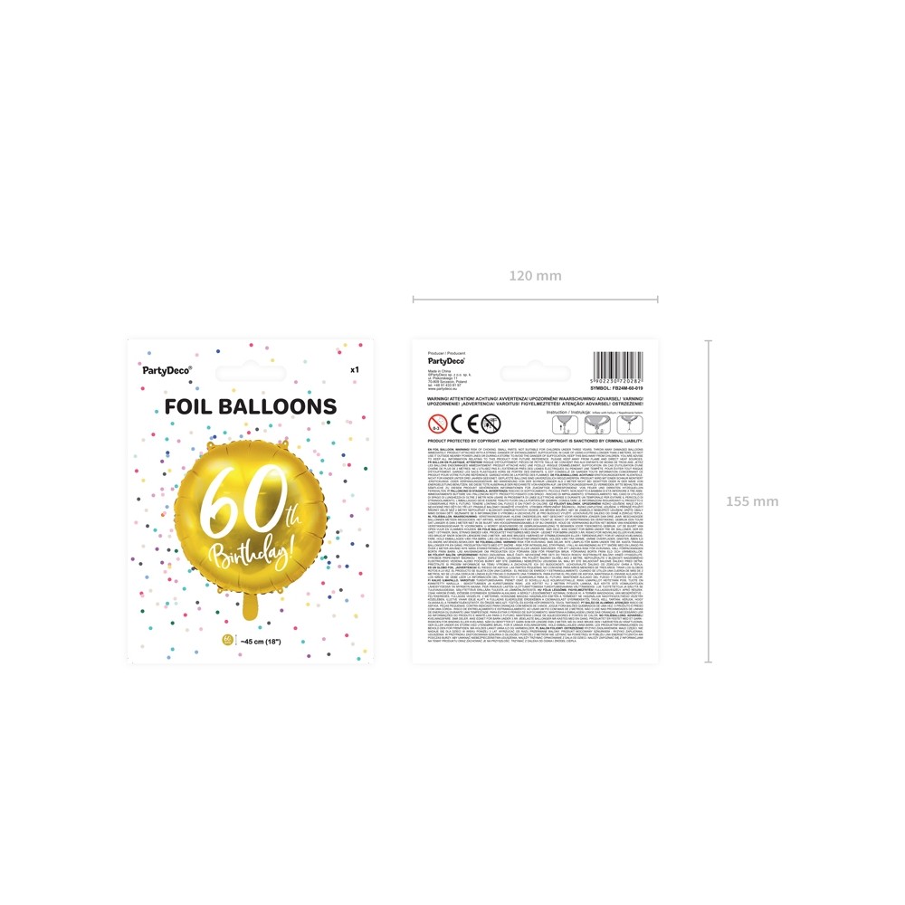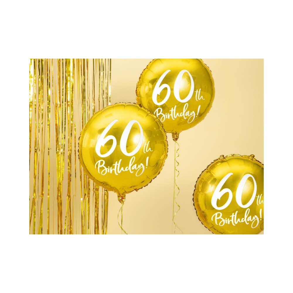 Un elegantissimo foil balloon dorato con scritta "60th Birthday!", la decorazione ideale per festeggiare il 60° compleanno! Si può gonfiare sia ad aria (tramite l'utilizzo di una pompetta) che ad elio.